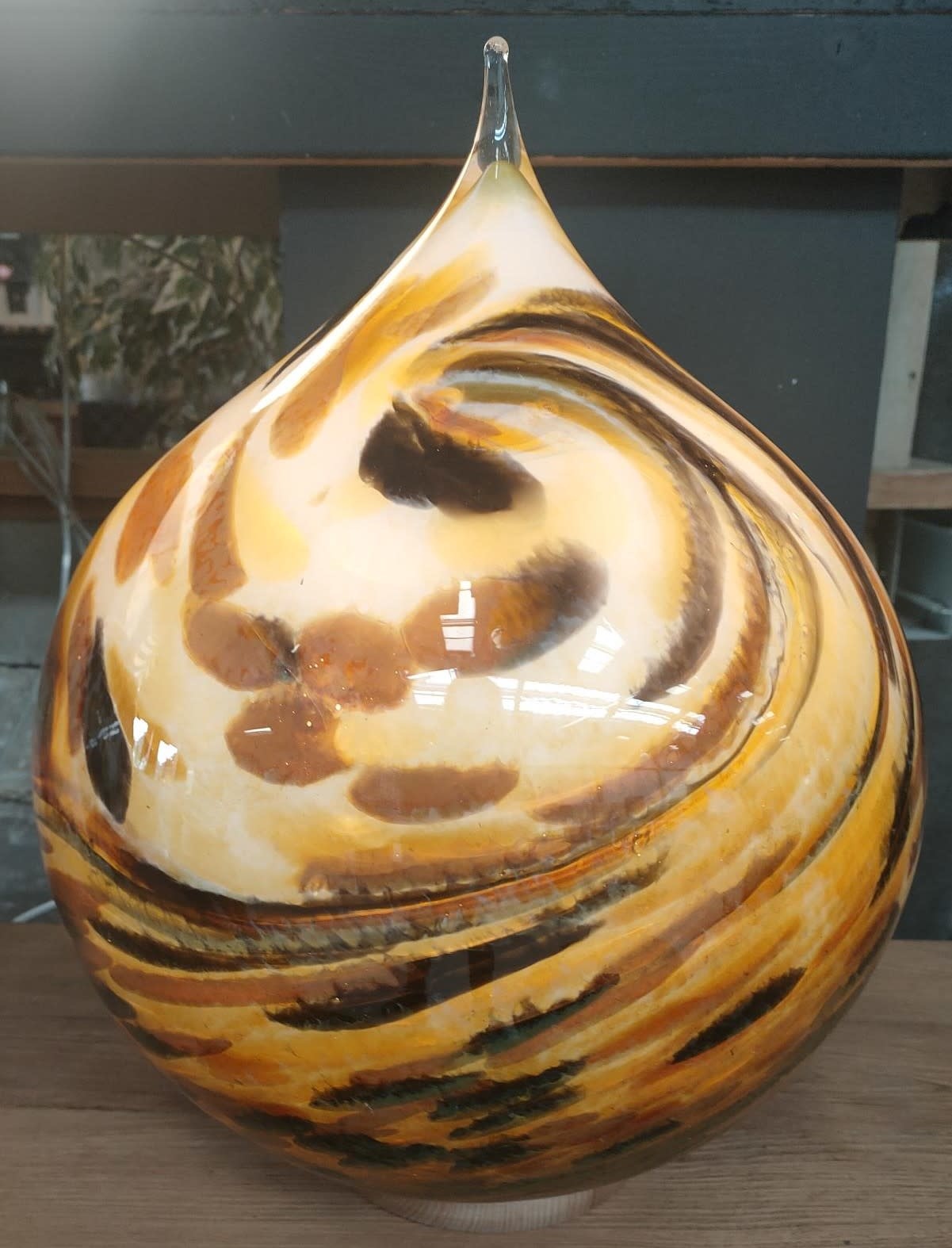 Deze grote lamp van dik glas zal een aanwinst zijn voor uw huis of bedrijf. Het is een uniek stuk glaswerk, omdat dit model mond geblazen is en daardoor elk exemplaar uniek is qua kleuren. De bruine kleuren met het witte glas genereert een geweldig mooi licht effect. Deze lamp van glas rust op een beukenhouten plateau van 15cm en is voorzien van een E14 fitting, met 1,2 mtr snoer met schakelaar. Het glas in een uien vorm kunt u zo op het plateau plaatsen. In deze lampen mogen alleen ledlampen gemonteerd worden, aangezien ledlampen nauwelijks warmte genereren.