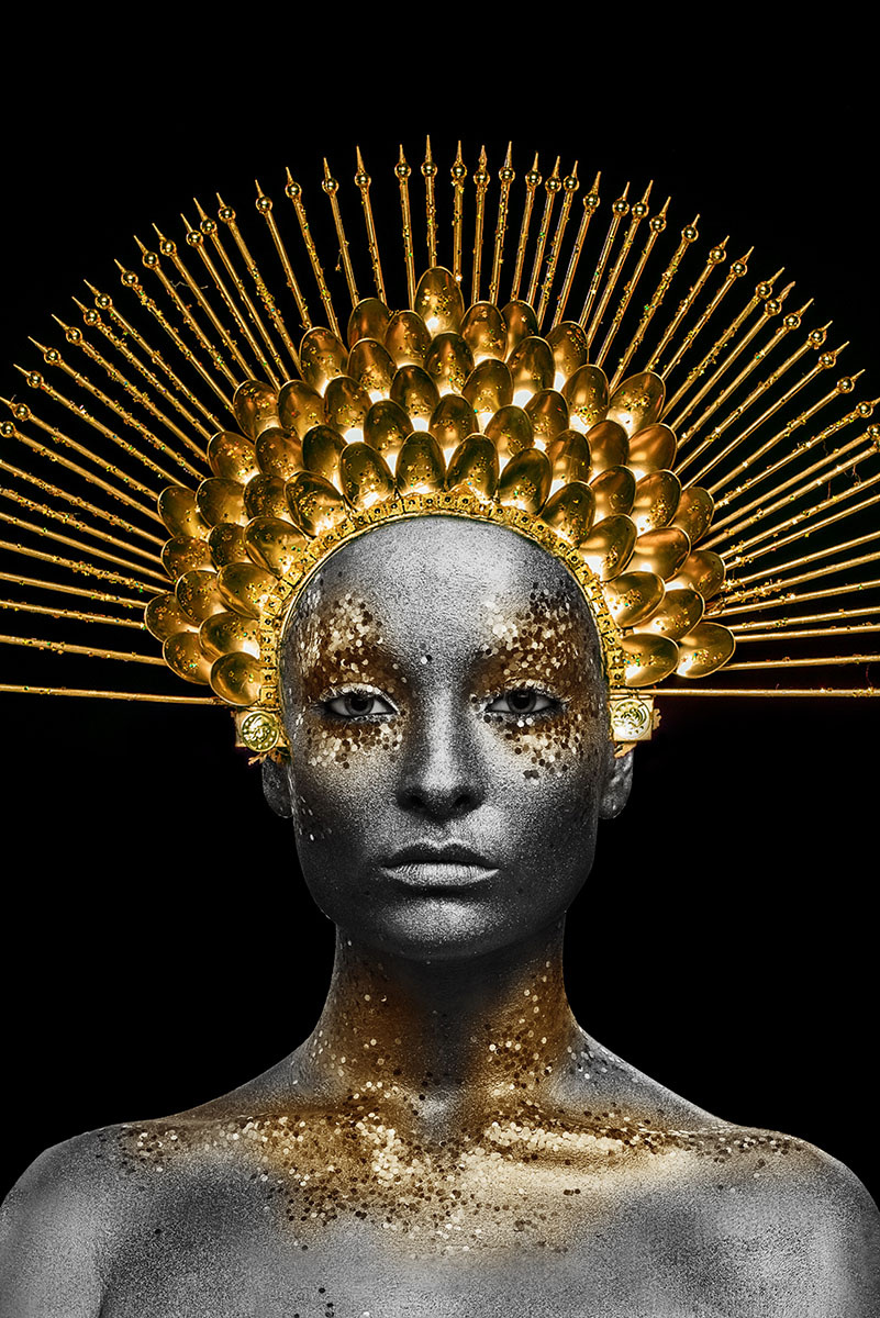 Dit is een hoge glasplaat met een gezicht in gouden en zilveren kleuren op een zwarte achtergrond.