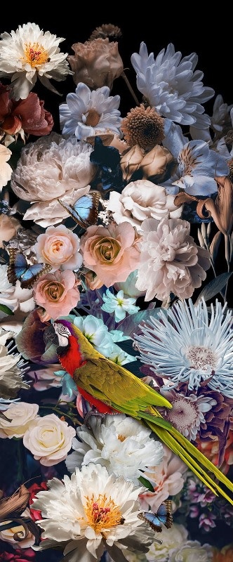 Dit is een smal, hoog glasschilderij met daarop een aantal dieren die worden omringd door vele bloemen in blauwe tinten.