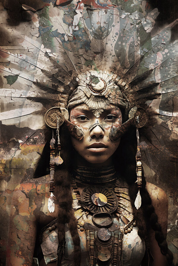 Dit is een hoge glasplaat met een indianenvrouw met een opvallend grote verentooi en lange oorbellen op een donkere achtergrond.