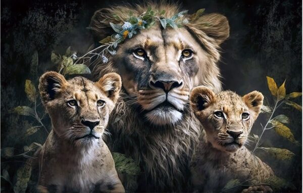 Dit is een breed model glasplaat met een leeuwin met haar welpen op een donkere achtergrond.