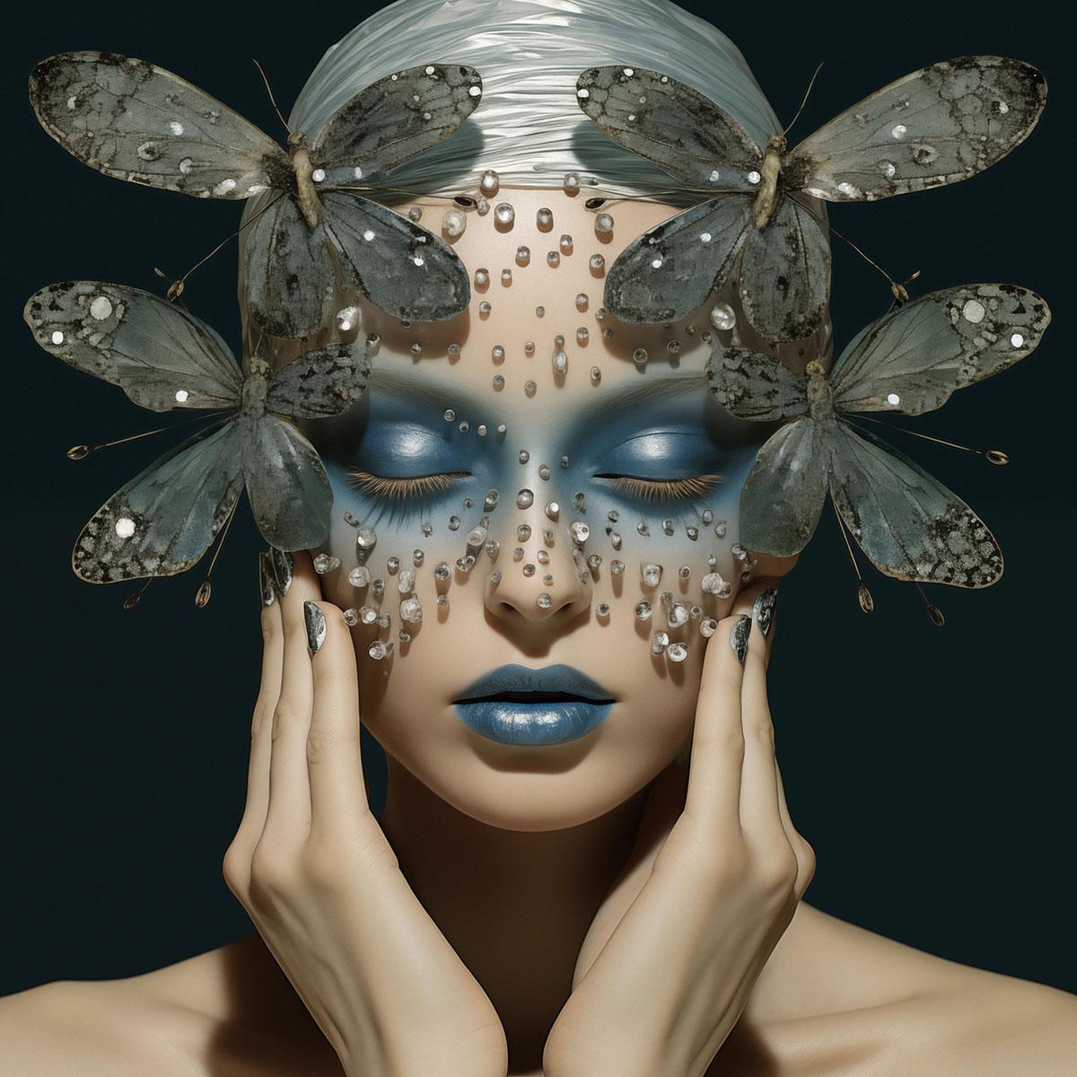 Dit is een vierkante glasplaat met een vrouw met diverse vlinders op een zwarte achtergrond.