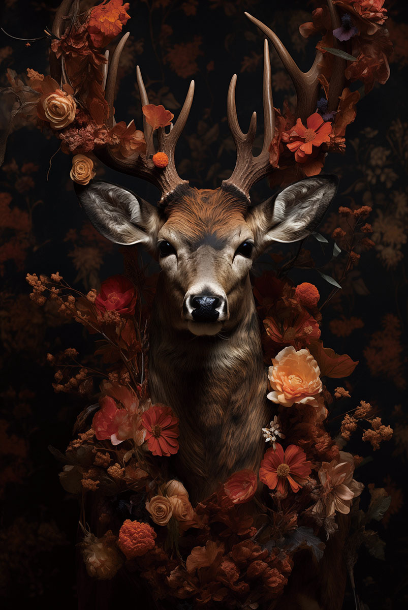 Dit is een hoge glasplaat met een hert die uit de bloemen komt op een donkere achtergrond.