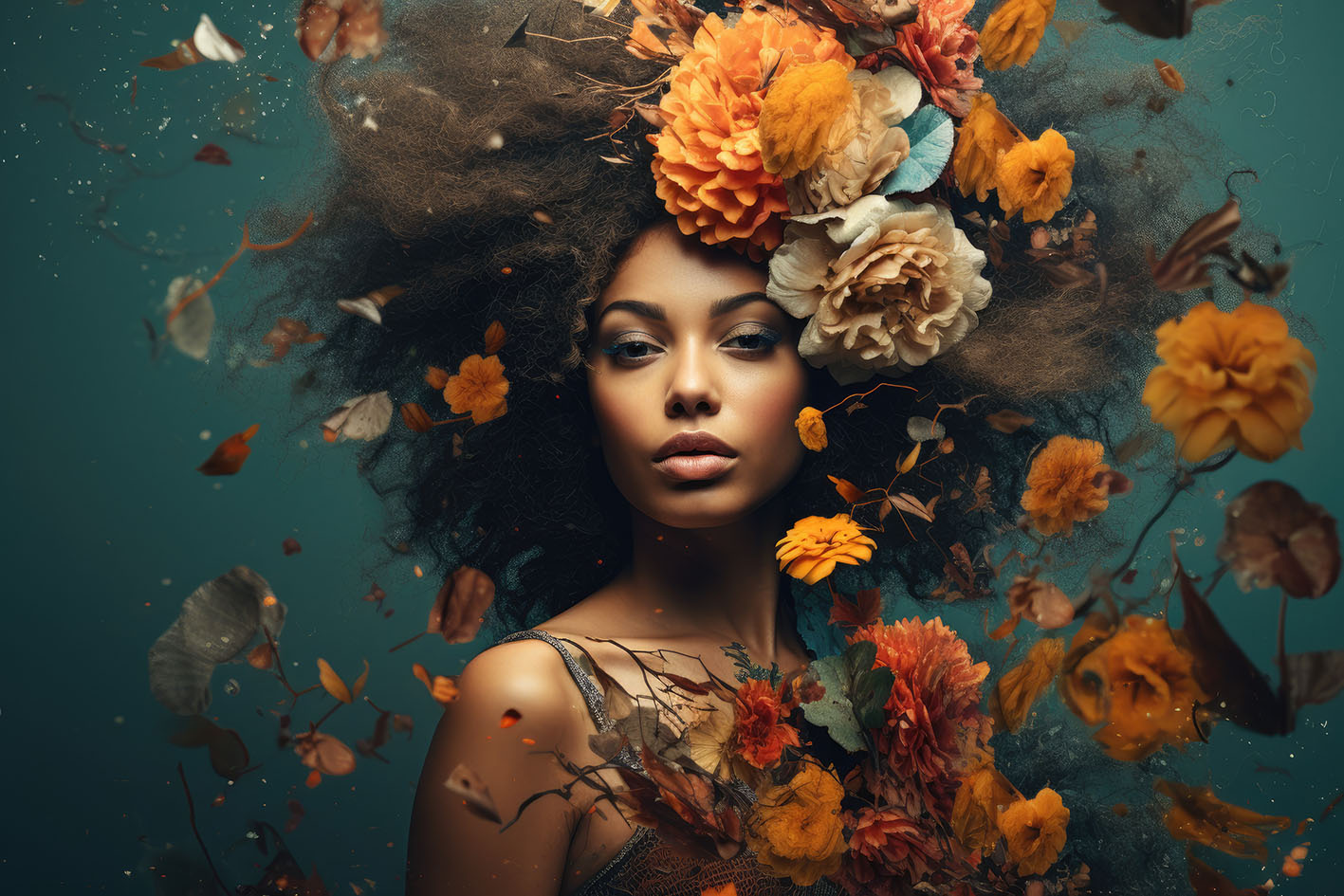 Dit is een langwerpige glasplaat met een donkere vrouw omringd met bloemen op een turquoise achtergrond.