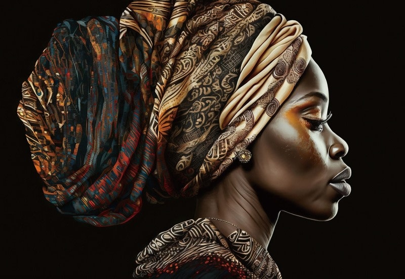 Dit is een zeer grote glasplaat met het zijaanzicht van een mooie vrouw met een grote hoofdband in donkere kleuren.