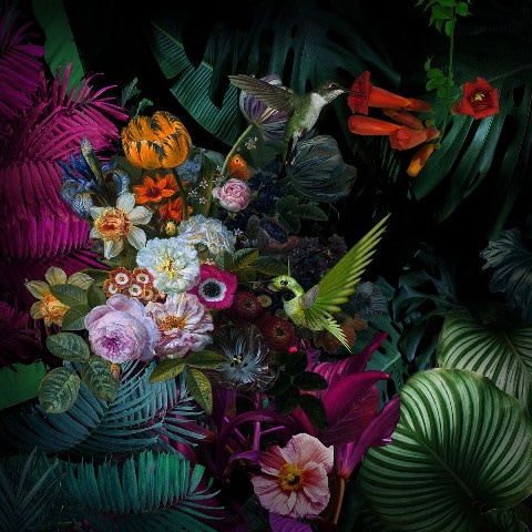 Dit is een vierkante glasplaat met bloemen en dieren in donkere kleuren.
