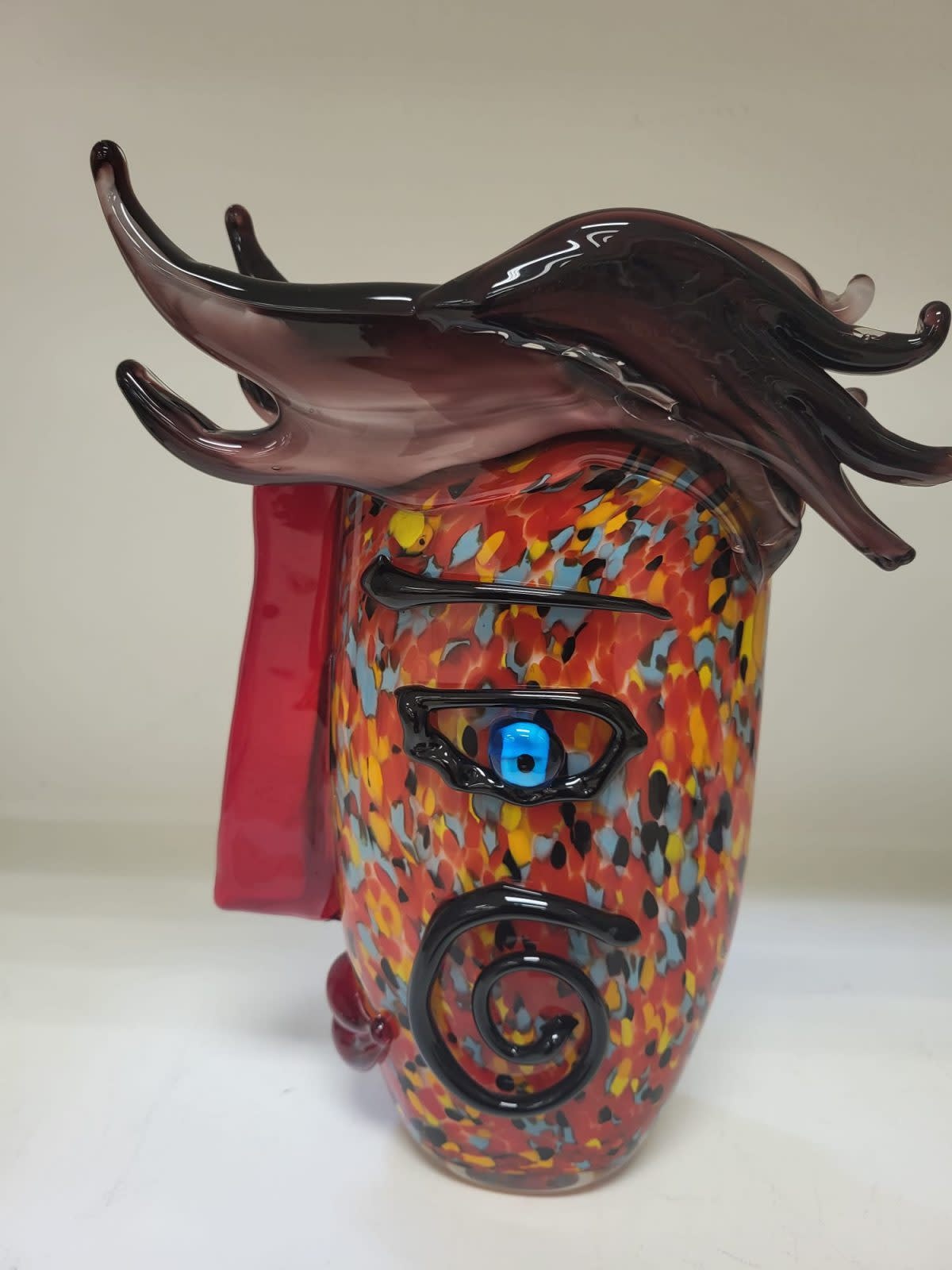 Deze gekleurde siervaas met daarop een gezicht verwerkt met vele kleuren is gemaakt op de ouderwetse ambachtelijke glasblaas- techniek. Bijzonder is hoe op de traditionele manier uit verschillende kleuren glas dit prachtige model glasvaas is verkregen.