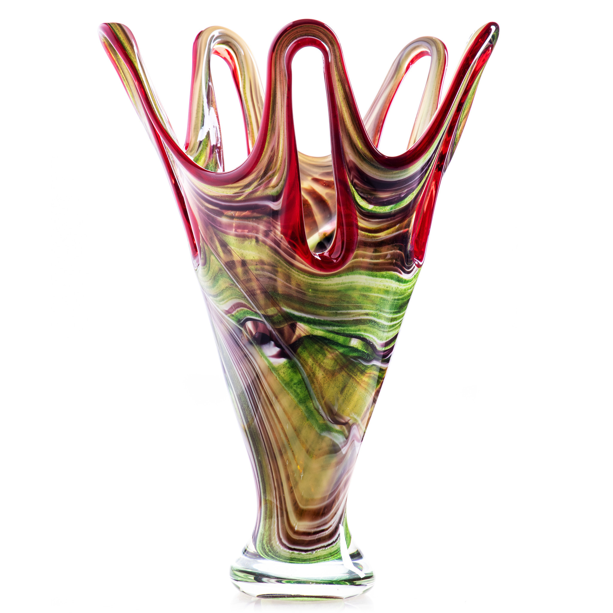 Deze uniek gevormde siervaas met vele kleuren en een rode rand is gemaakt op de ouderwetse ambachtelijke glasblaas- techniek. Bijzonder is hoe op de traditionele manier uit verschillende kleuren glas dit prachtige model glasvaas is verkregen.