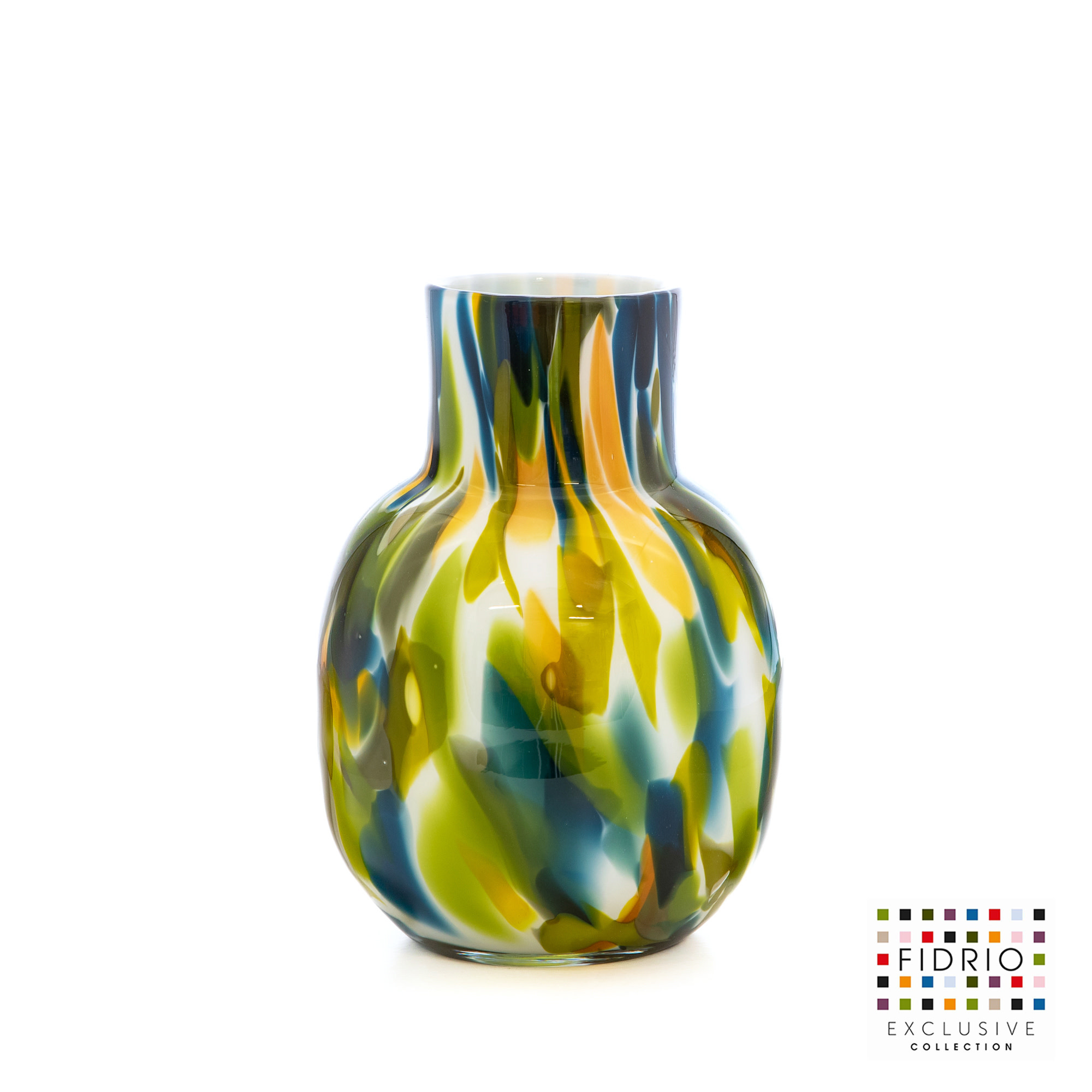 Alle glasvazen van Fidrio zijn handmatig gemaakt op de traditionele, ambachtelijke wijze. Het bewerkbare super hete glas wordt in een houten mal geblazen, waarbij de mal als basisvorm dient, maar de kleurschakeringen en daarmee ook de uitstraling zullen bij elke vaas anders zijn. De opgegeven maten zijn altijd Circa maten.