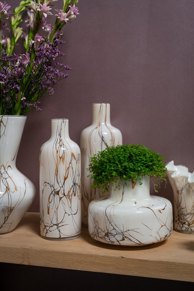 Alle glasvazen van fidrio zijn handmatig gemaakt op de traditionele, ambachtelijke wijze. Het bewerkbare super hete glas wordt in een houten mal geblazen, waarbij de mal als basisvorm dient, maar de kleurschakeringen en daarmee ook de uitstraling zullen bij elke vaas anders zijn. De opgegeven maten zijn altijd Circa maten.