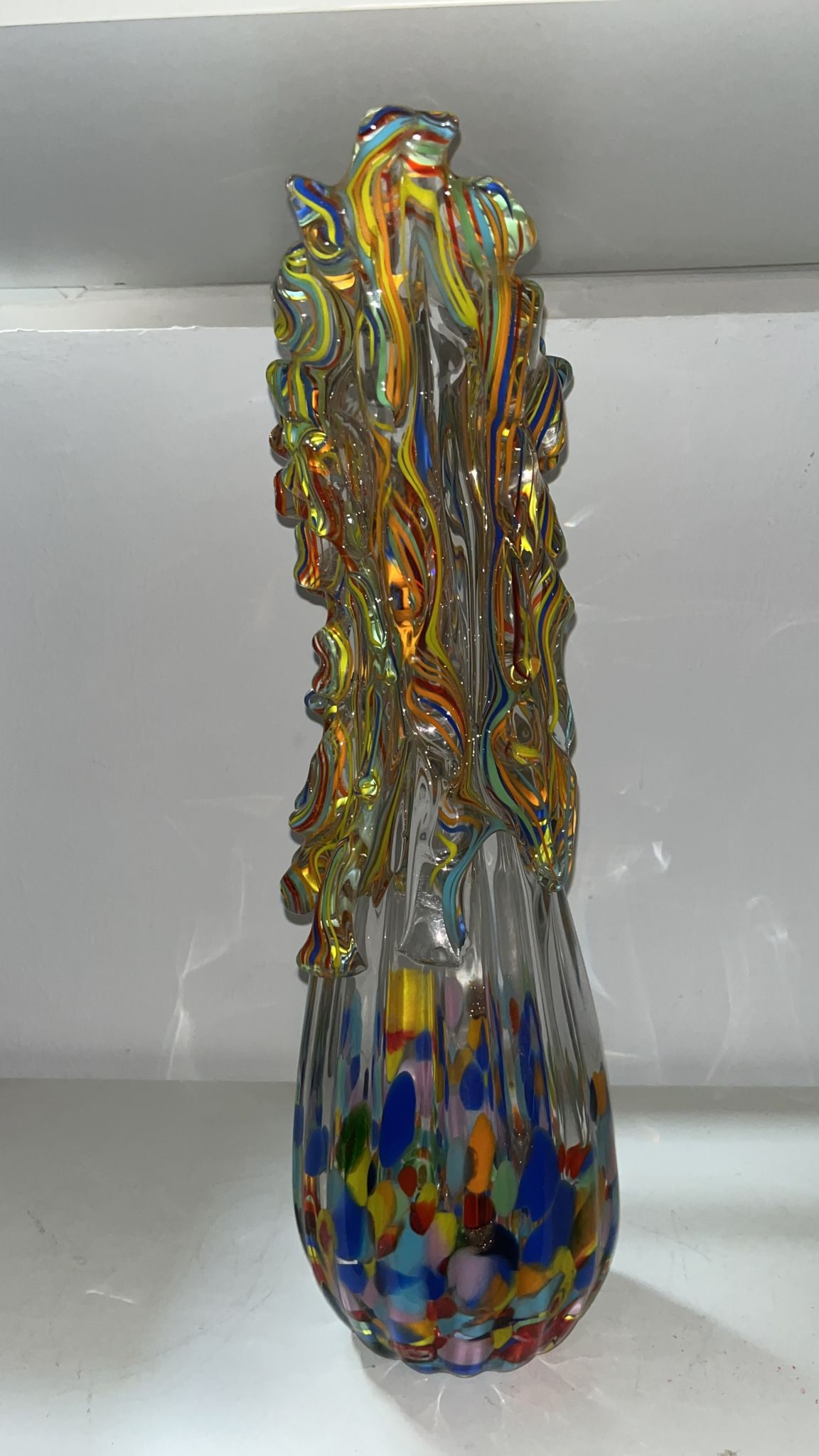 Deze doorzichtige en gekleurde siervaas is gemaakt op de ouderwetse ambachtelijke glasblaas- techniek. Bijzonder is hoe op de traditionele manier uit verschillende kleuren glas dit prachtige model glasvaas is verkregen.