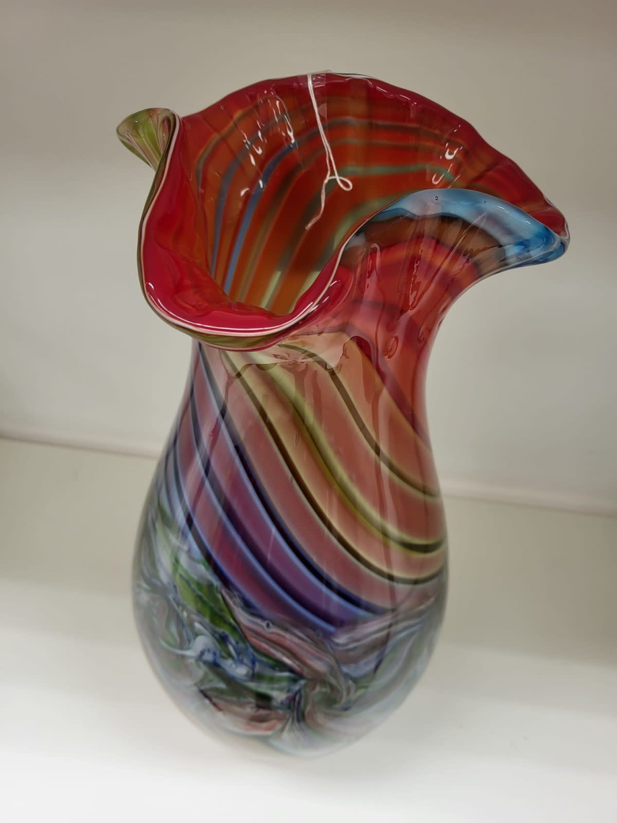 Deze kleurrijke siervaas is gemaakt op de ouderwetse ambachtelijke glasblaas- techniek. Bijzonder is hoe op de traditionele manier uit verschillende kleuren glas dit prachtige model bloemenvaas is verkregen.