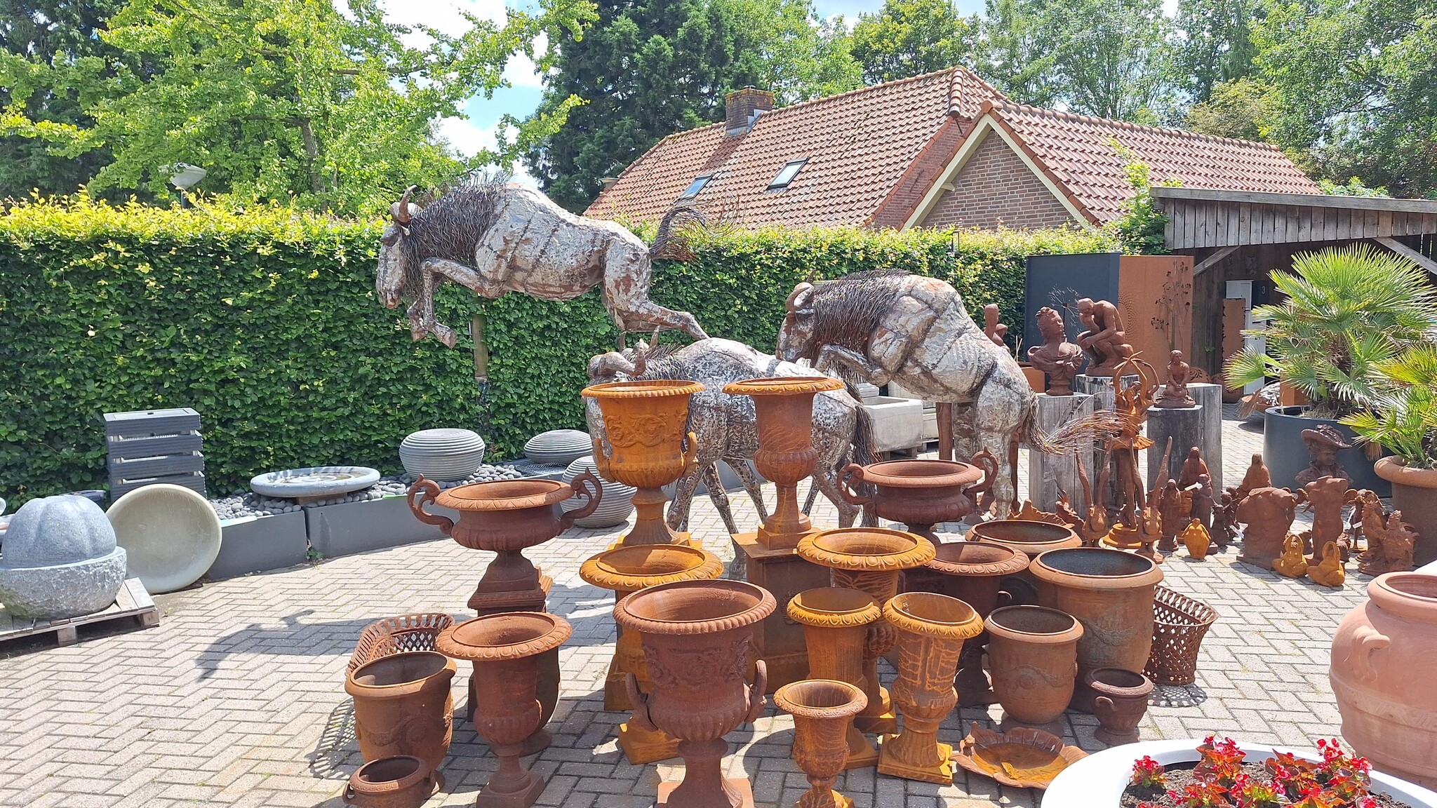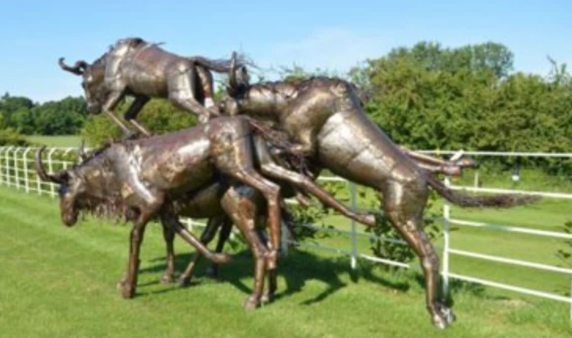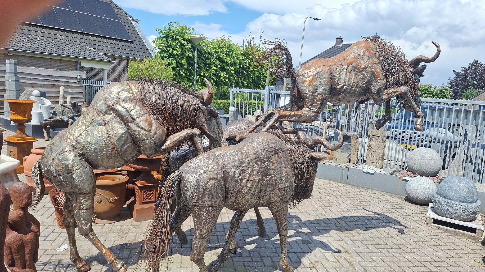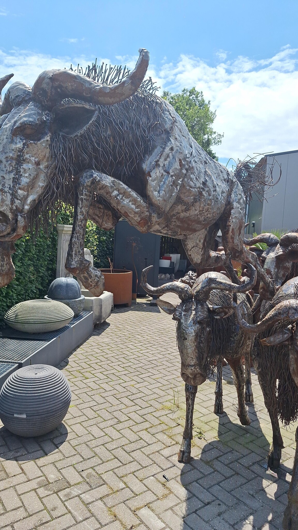 Het zijn echte kunstenaars, die dit beeld van een levensgrote kudde met 4 gnoe’s gemaakt hebben. Als je dit beeld lang bekijkt ga je beseffen hoeveel werk het is om een kunstwerk als dit te maken. Kloppen, buigen, lassen, meten, het is echt een gigantisch werk. Wilt u iets unieks in uw tuin of bij uw bedrijf, dan bent u er zeker van dat dit model zeer zeldzaam is en niet zomaar te koop is. !!