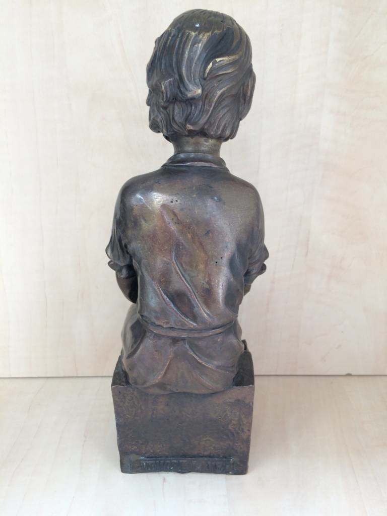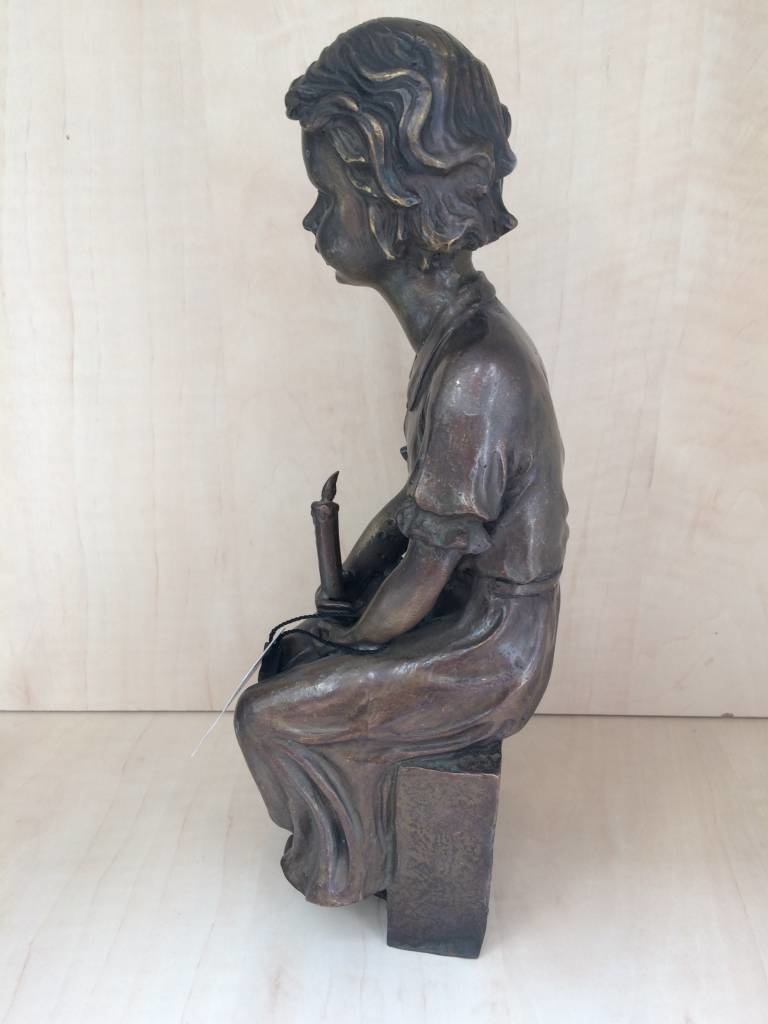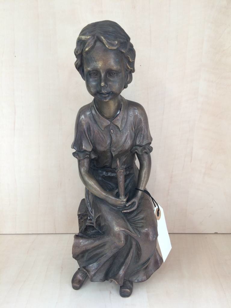 Mooi beeld van een meisje, zittend op een steen, met een kaars, van hoogwaardig brons met een minimale kopergehalte van 75% waardoor een eeuwenlange levensduur gegarandeerd is.