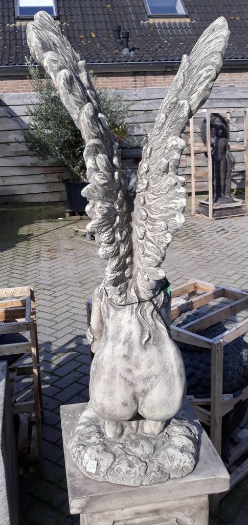 Groot tuinbeeld Engel met vleugels voorovergebogen 114cm