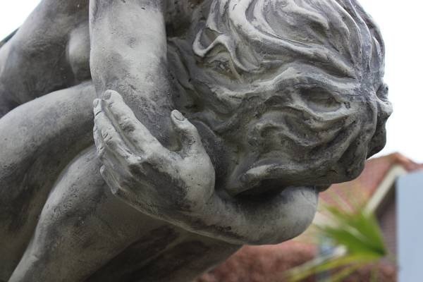 Prachtig vormgegeven voorovergebogen Engel met vleugels, van hoogwaardige massief gietsteen, grijs ingewassen.