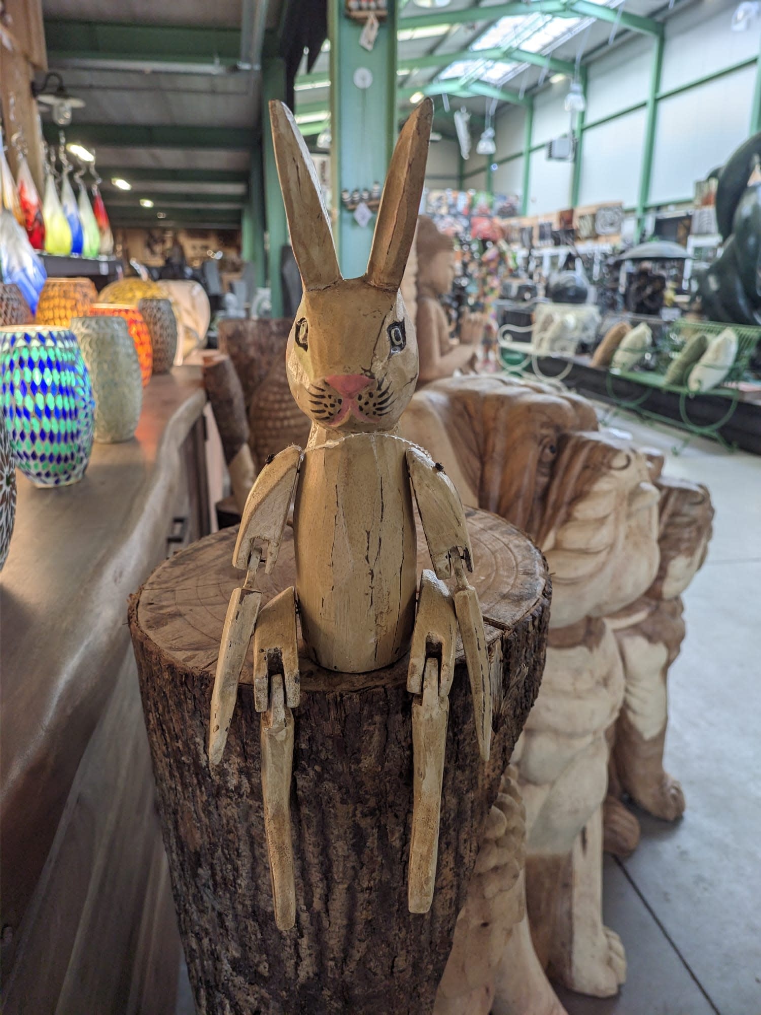 Prachtig stukje vakwerk, deze zittende haas met zijn beentjes over de rand van 25cm hoog, handmatig gemaakt van massief Suar hout.