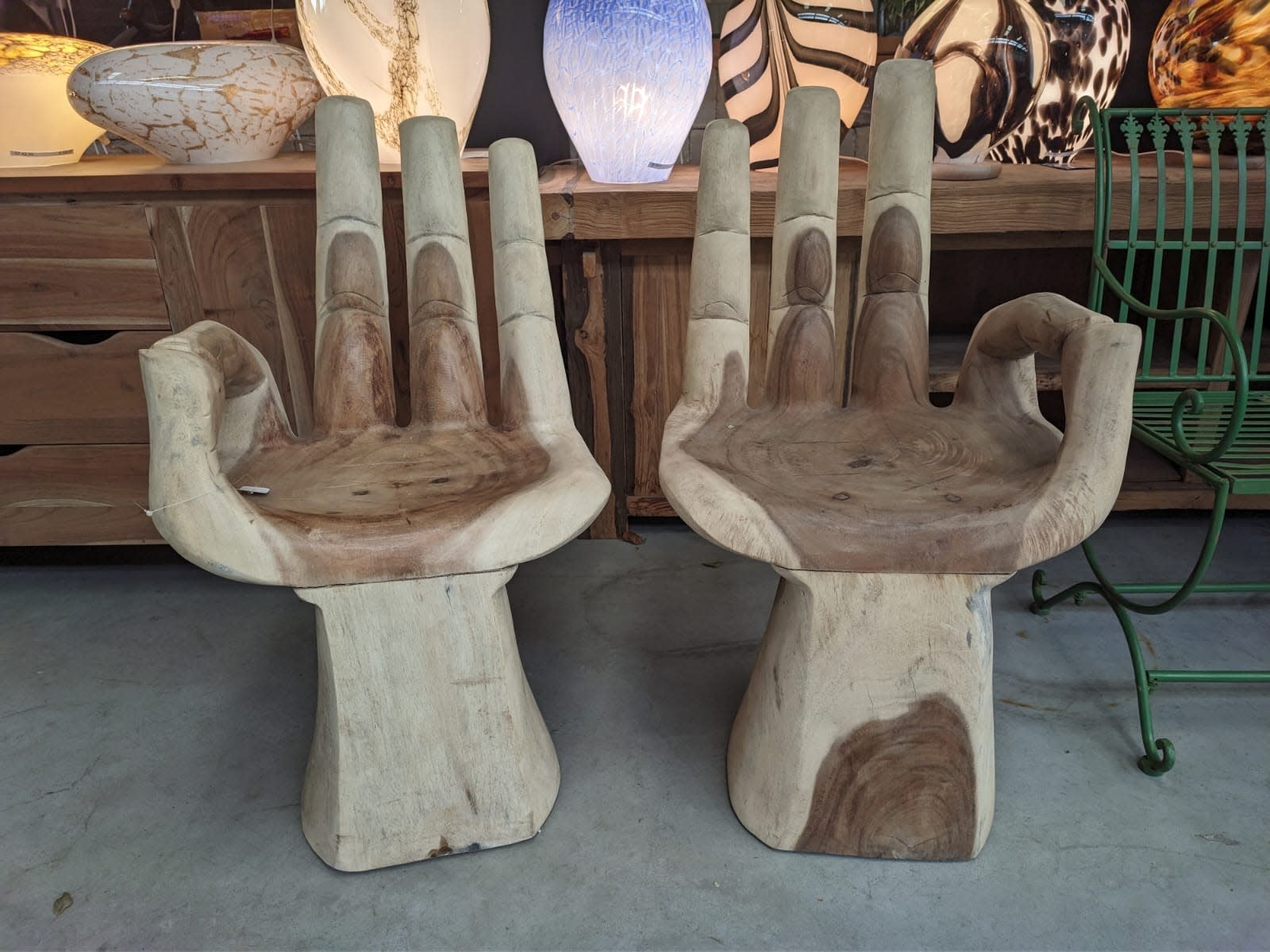 Prachtig stukje vakwerk, deze set handstoelen, handmatig gemaakt van massief Suar hout. Het is zeer knap hoe de vorm is weer gegeven. Zeer veel uren werk heeft aan dit model gezeten, om uit een blok harde suar hout deze stoelen te realiseren.