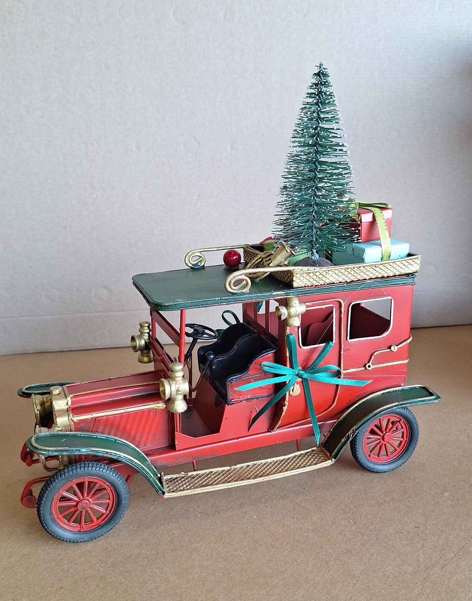 Prachtig met de hand gemaakt model van een rode oldtimer auto, geladen met kerst cadeau’s.