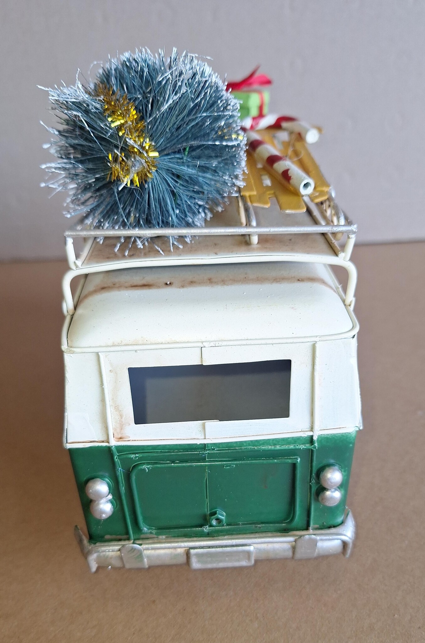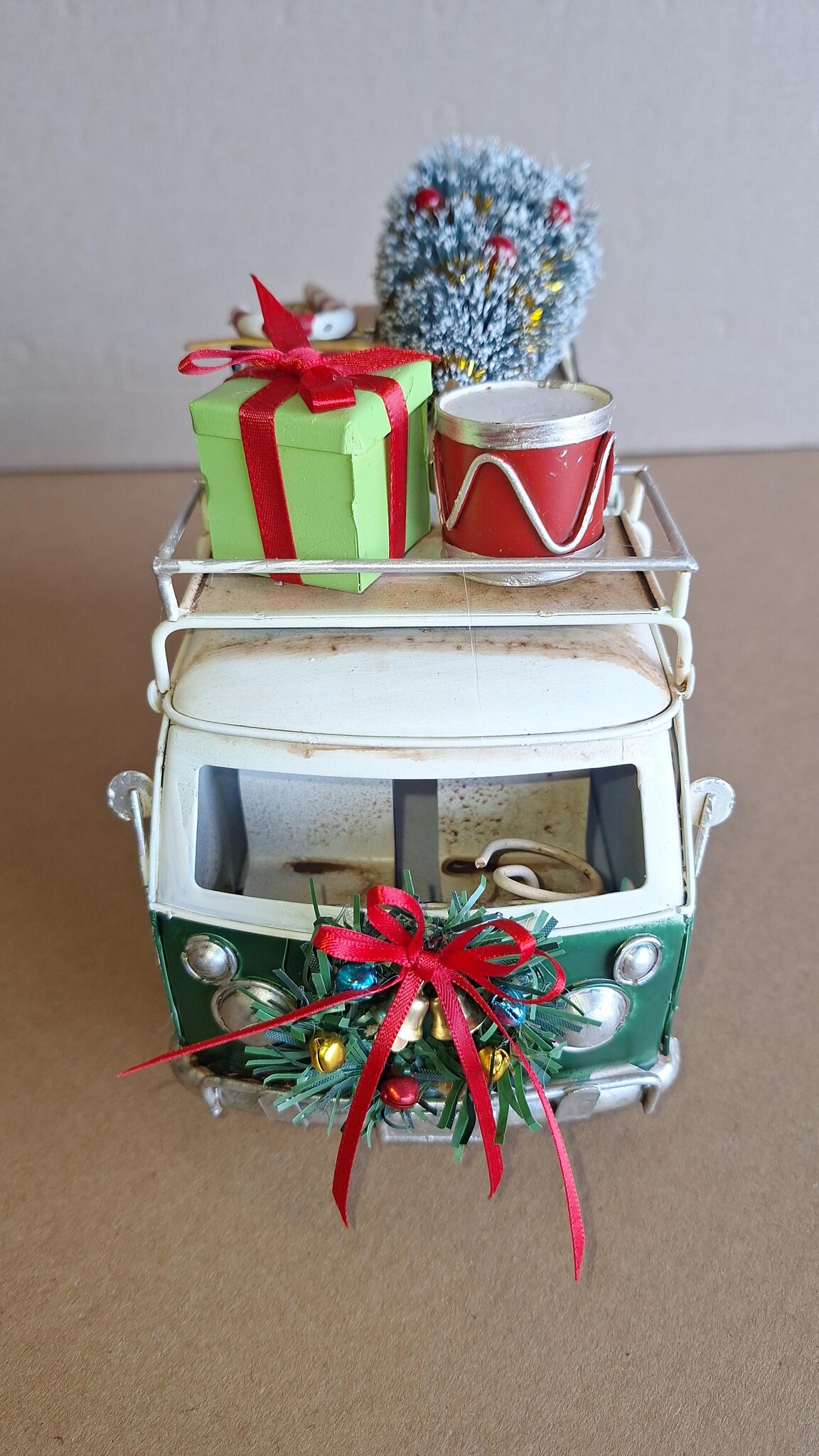 Prachtig met de hand gemaakt model van een groene vw bus in kerstsfeer, geladen met kerst cadeau’s.