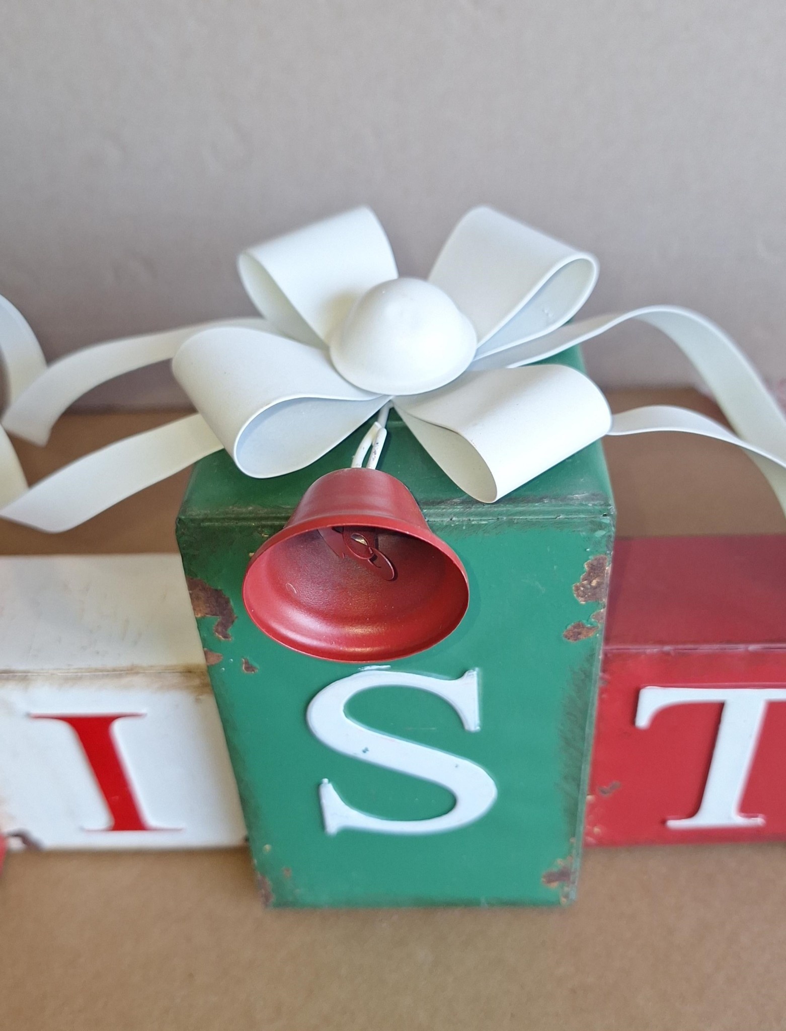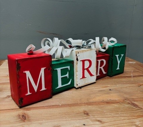 Prachtig met de hand gemaakt grote metalen kerst versiering in de vorm van 2 rijen kadootjes met daarop de tekst “merry christmas”.