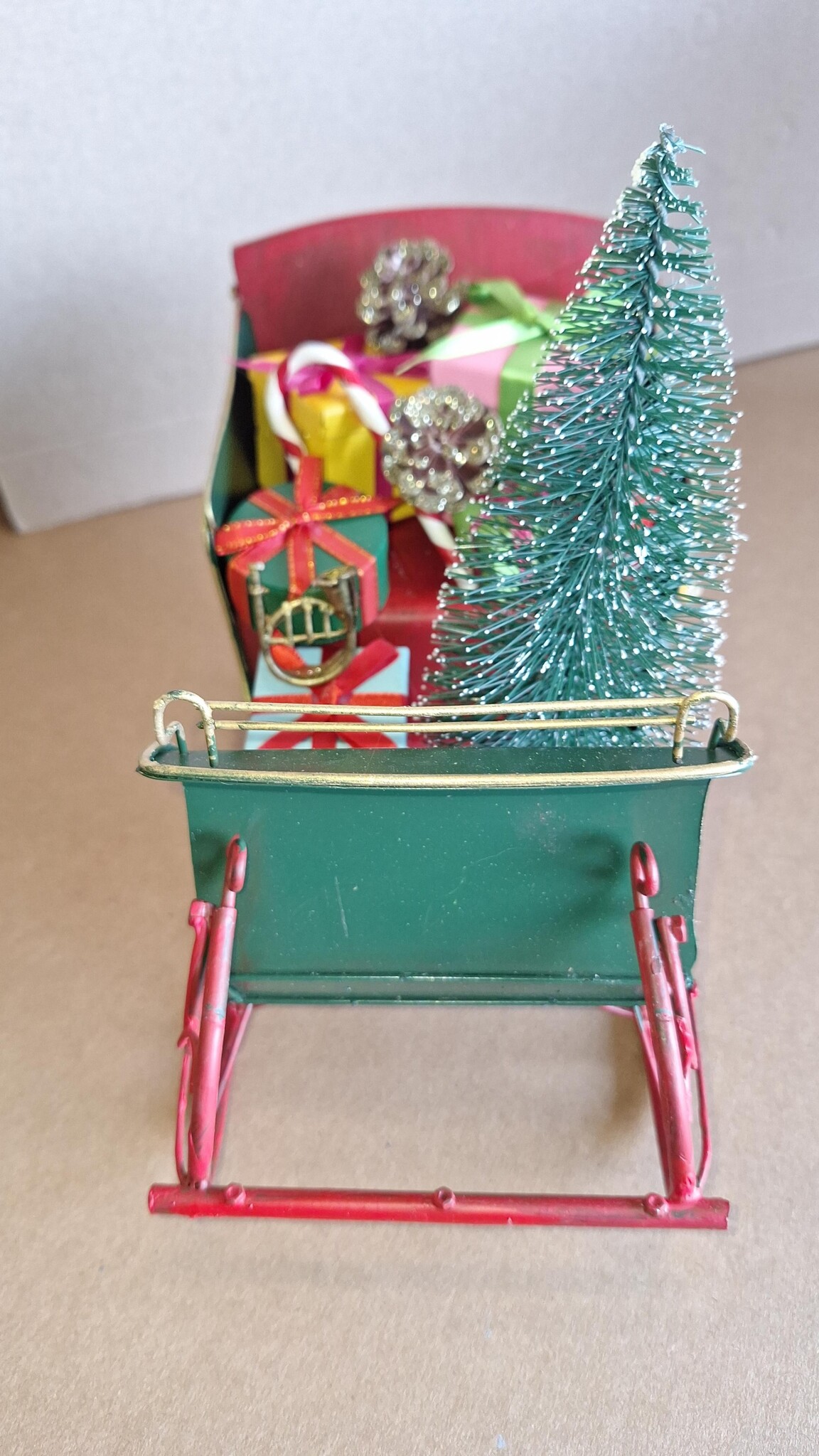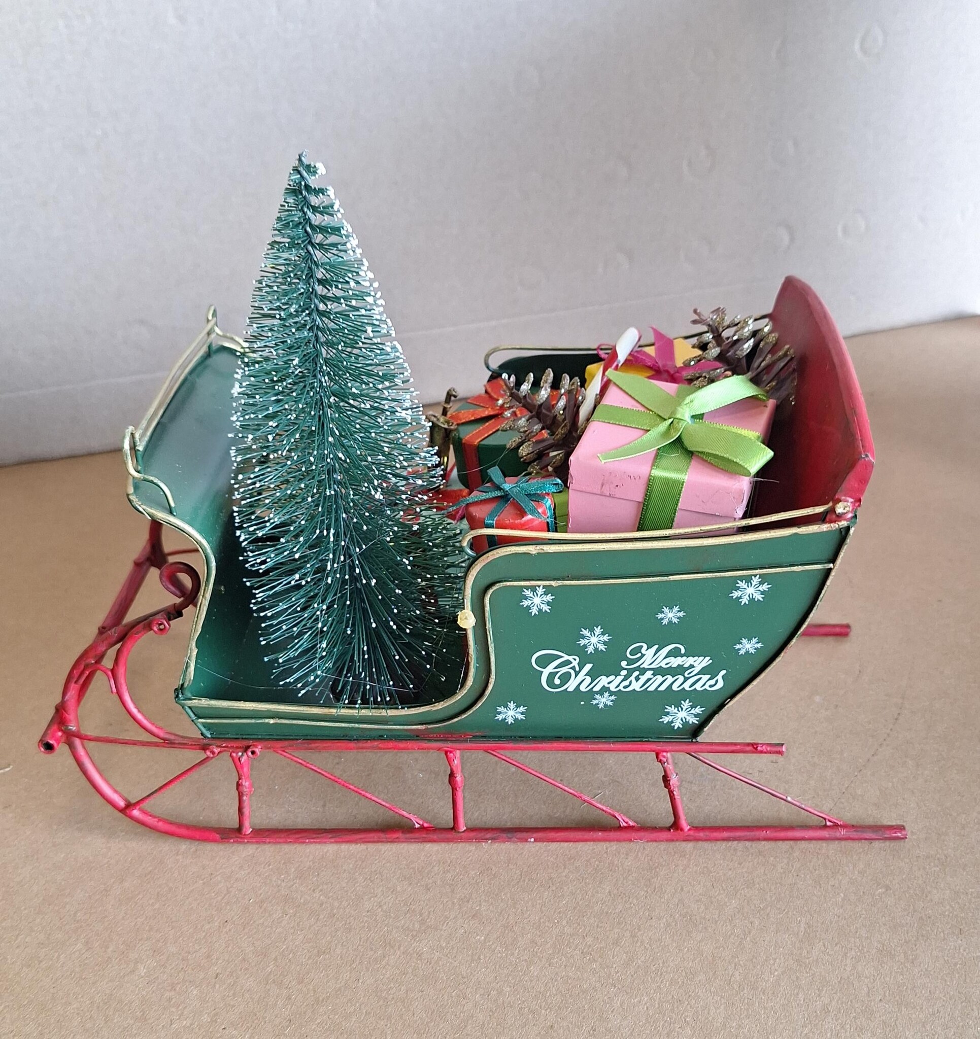 Prachtig met de hand gemaakt model van een rode metalen arreslee, geladen met kerst cadeau’s.