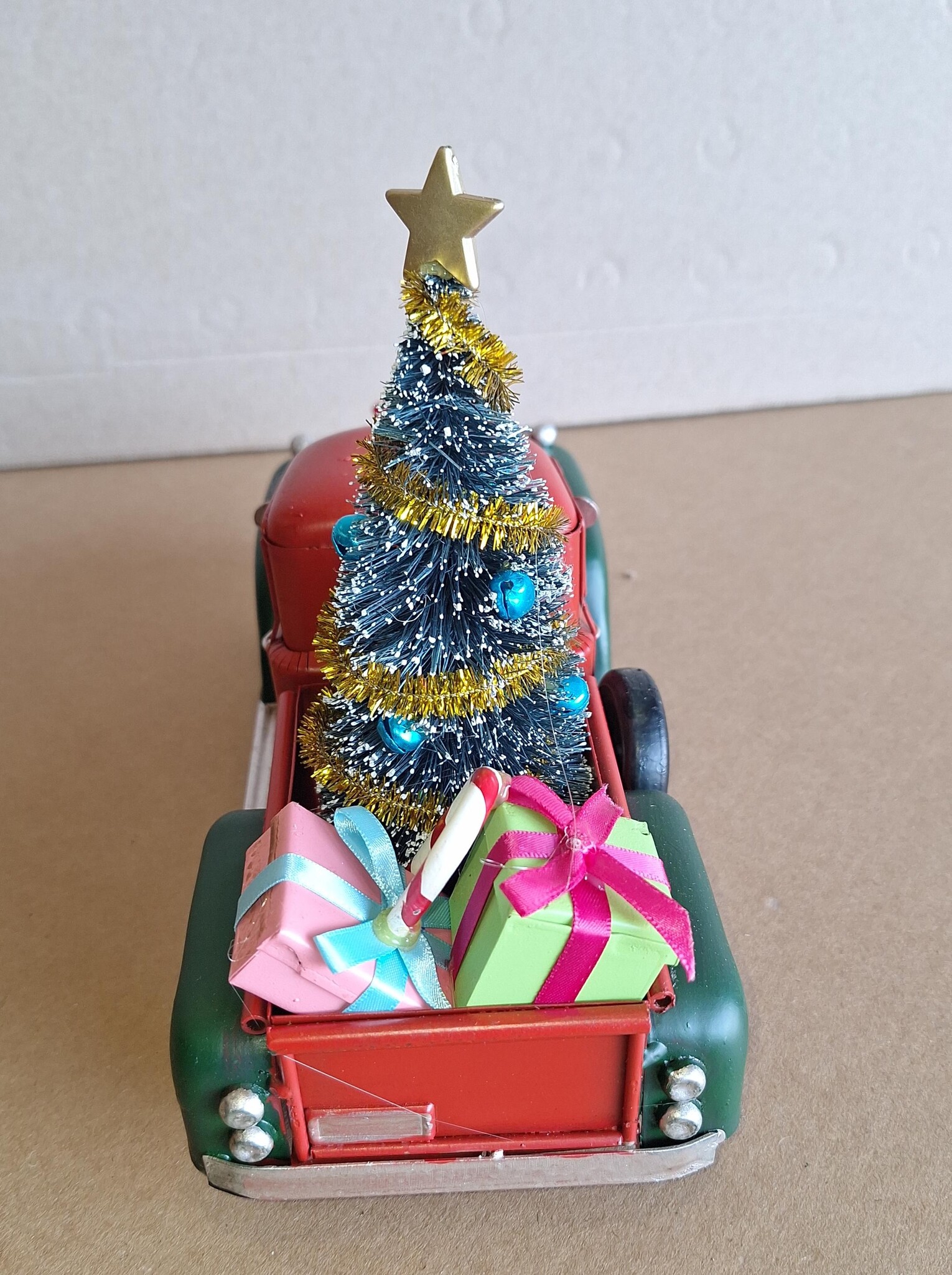 Prachtig met de hand gemaakt model van een rode vrachtauto, geladen met kerst cadeau’s.