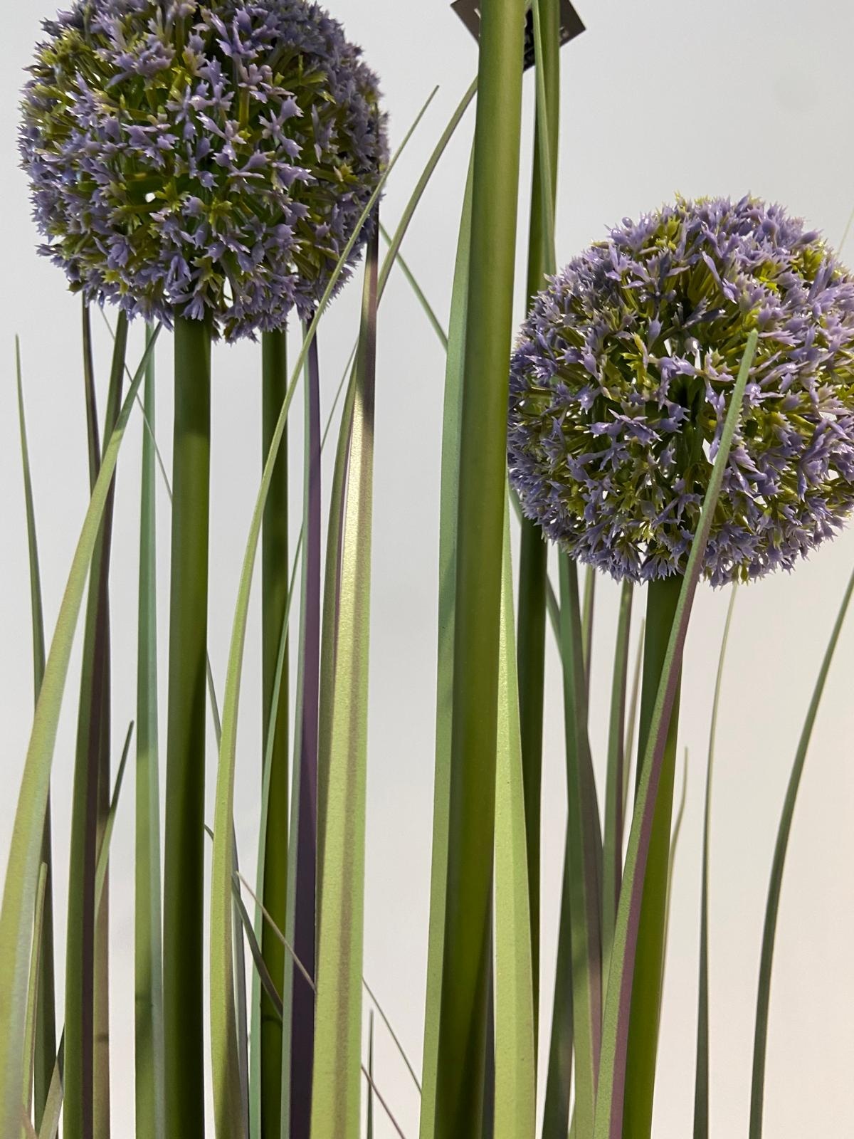 Dit natuurgetrouwe model Allium plant met 5 blauwe bollen is gemaakt van de fijnste gerecycelde kunststof soorten, en staat goed op zichzelf door de pot waarin de plant staat. De plant vult lege plaatsen heel snel door de grote hoogte en brede uitwaaiering. Gecombineerd met andere zijdeplanten, samen in 1 grote pot kunt u een mooi plantenarrangement maken, waar u geen omkijken meer naar heeft.
