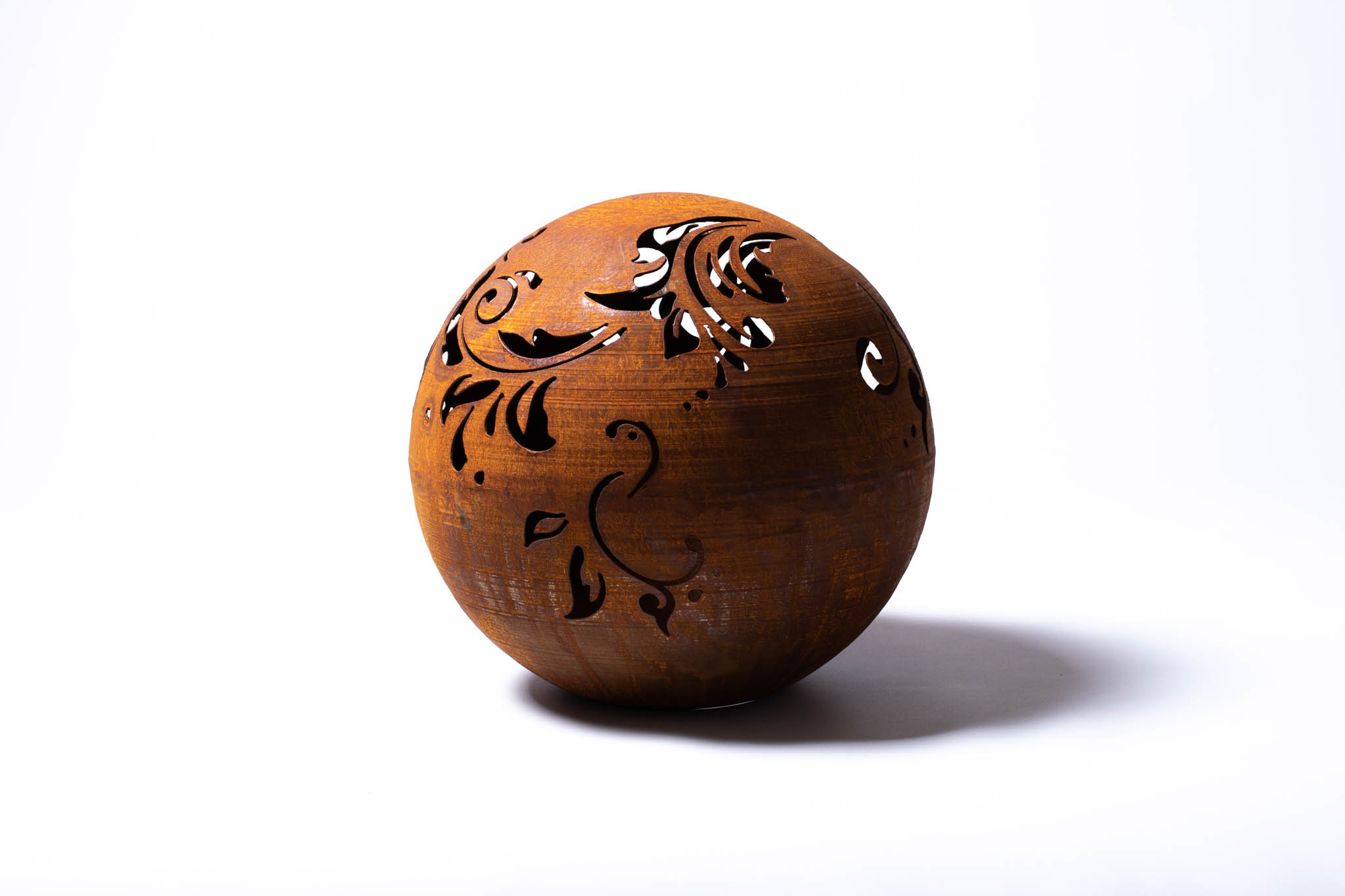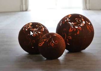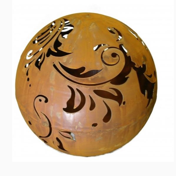 Een aparte sfeermaker in uw tuin, Zo kun je deze tuinlamp in de vorm van een bol toch wel noemen. Uit deze bol is een prachtige figuur gehaald, beetje barok stijl, waardoor in het donker warmwit licht schijnt. Deze lichtbol is gemaakt van 2mm dik onbehandeld ijzer, wat een prachtige en tijdloze (roest)bruine kleur geeft.
