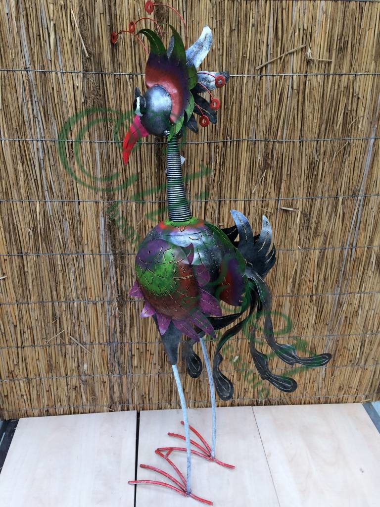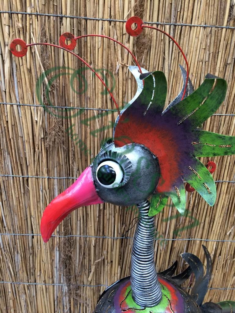 Schitterend afgewerkste metalen figuur van een grote fantasie vogel. Kop is verend gemaakt. Een sierraad in huis of tuin en mooi om kado te doen. Helemaal met de hand gemaakt en geverfd.