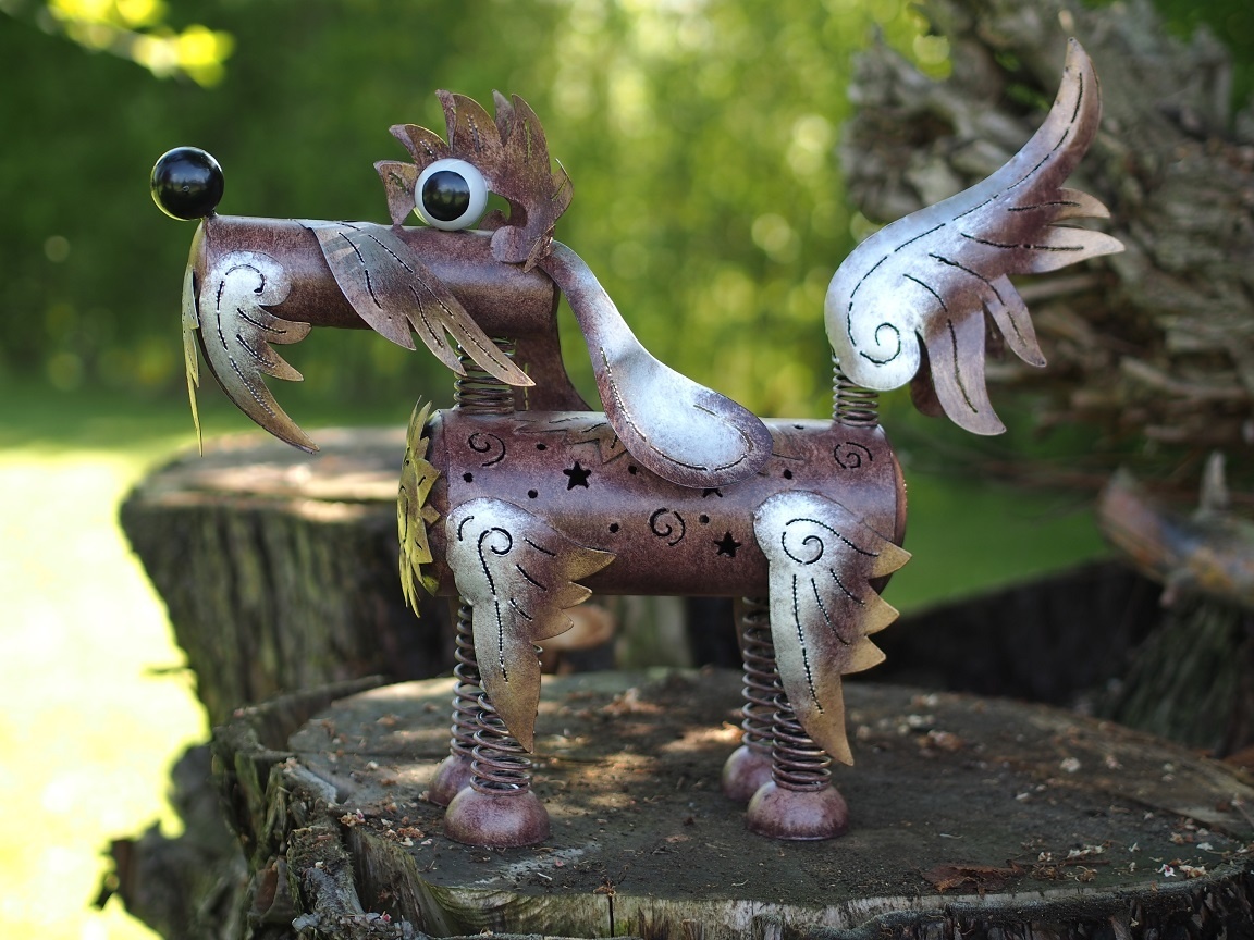 Schitterend afgewerkste metalen figuur van een grote hond. Een sierraad in huis of tuin en mooi om kado te doen. Helemaal met de hand gemaakt en geverfd.