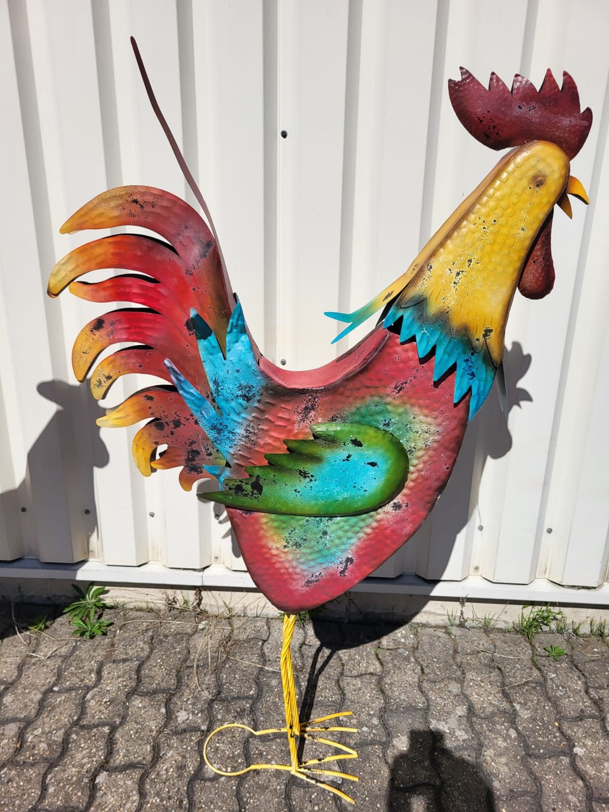 Schitterend afgewerkt metalen figuur van een haan, in moderne kleuren, van wel 155cm hoogte!