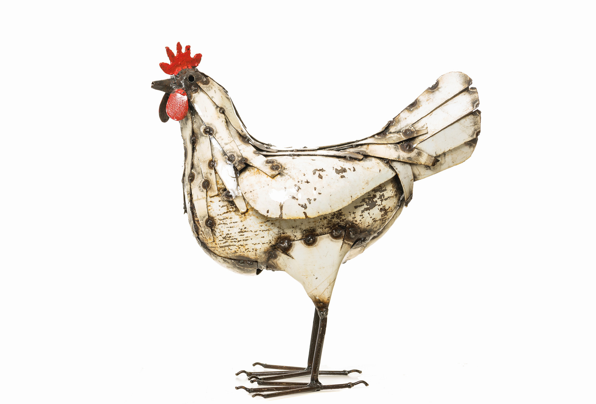 Metalen kip, met de hand gemaakt en beschilderd, afkomstig uit Zimbabwe.