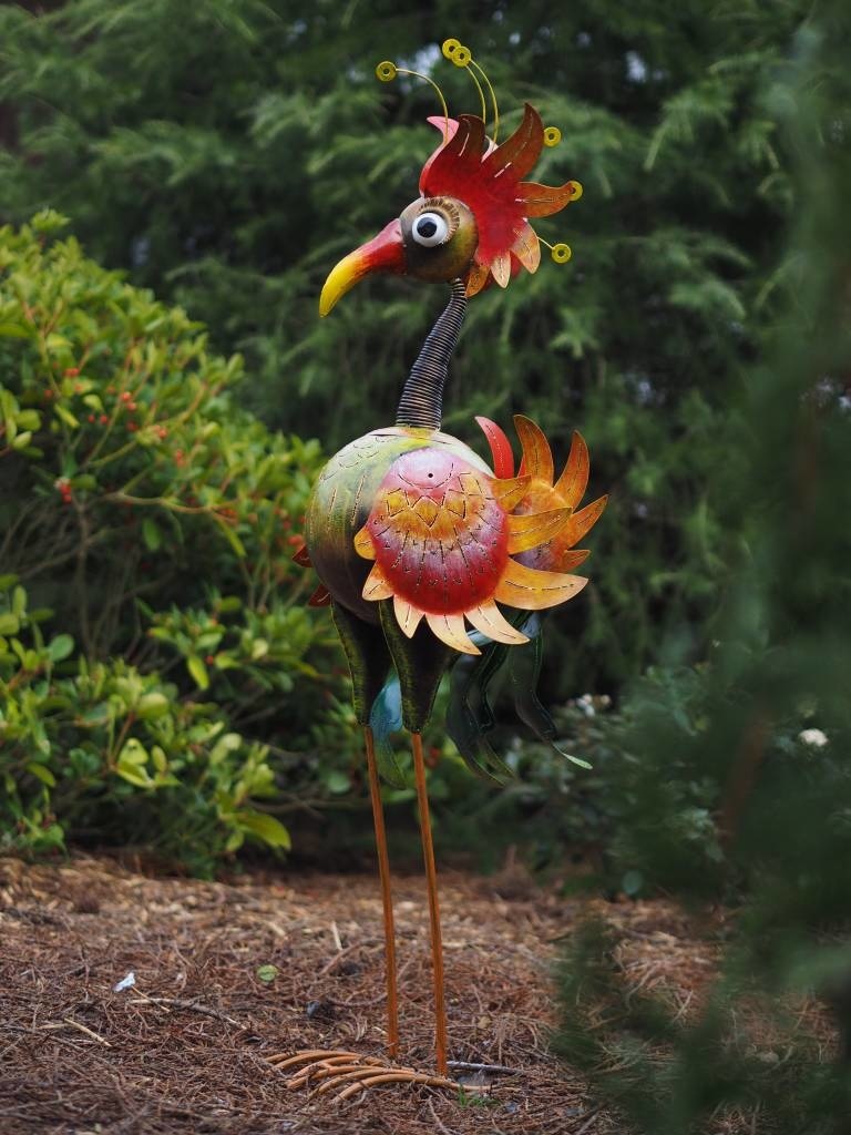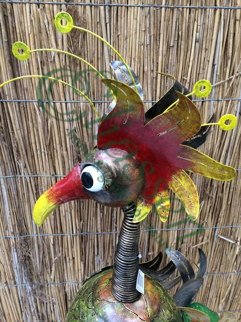 Schitterend afgewerkte metalen figuur van een fantasie vogel, in moderne kleuren. Deze metalen vogelfiguur is een sierraad in huis of tuin of zeer leuk om kado te doen. Helemaal met de hand gemaakt en geverfd.