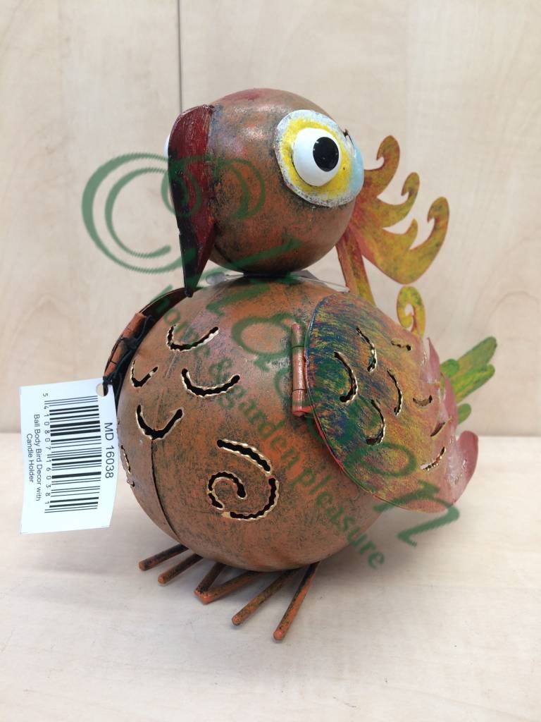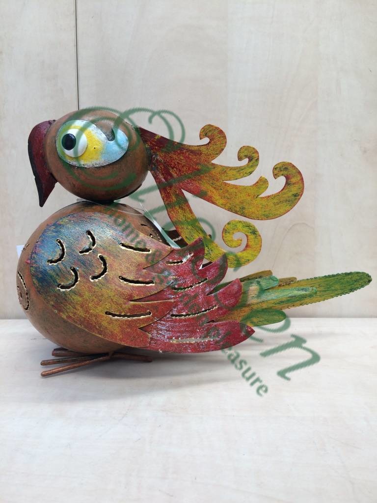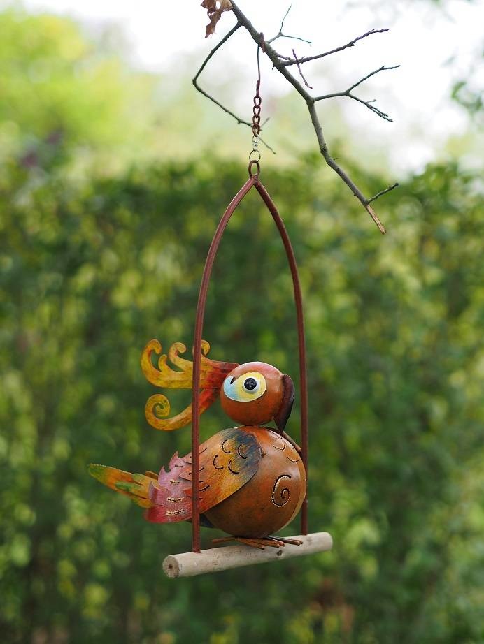 Schitterend afgewerkte metalen combinatie van een vogel en hanger waar die in zit op houten stok. Een sierraad in huis of tuin en mooi om kado te doen. Helemaal met de hand gemaakt en geverfd.