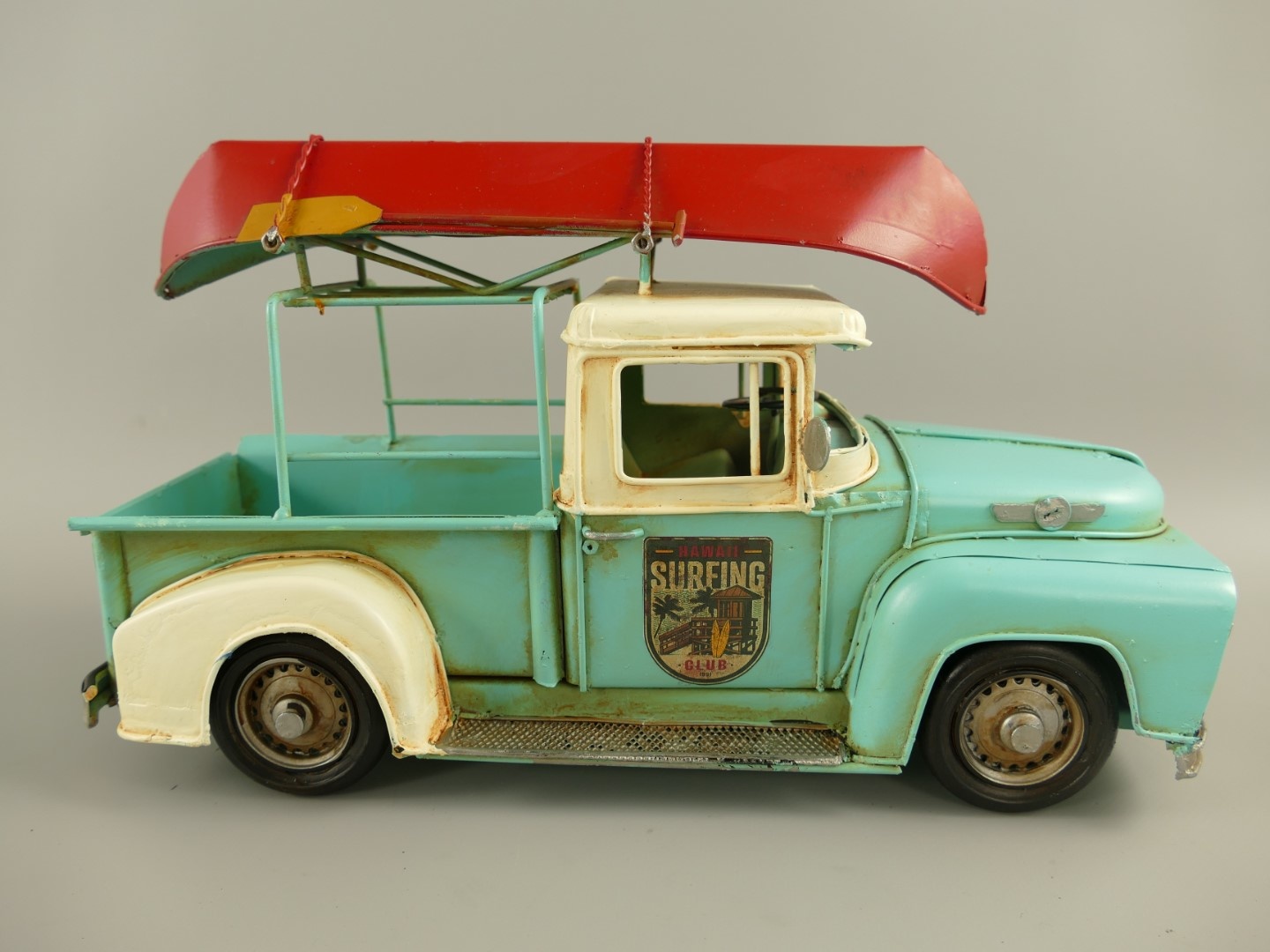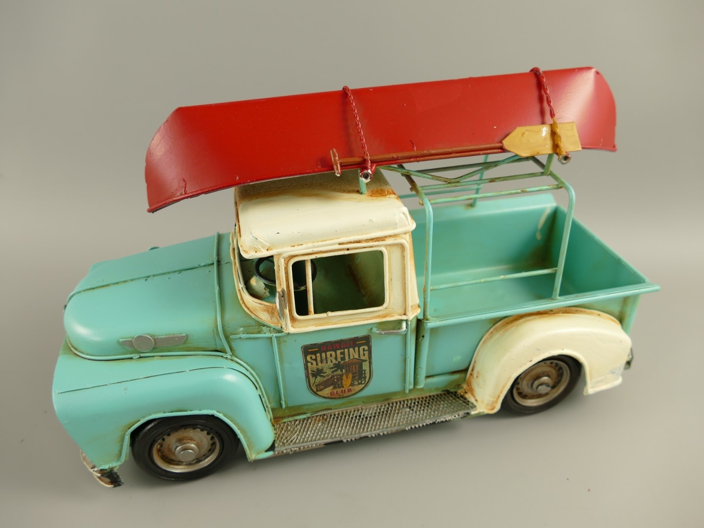 Prachtig met de hand gemaakt model van een open wagen met een kano op het dak.