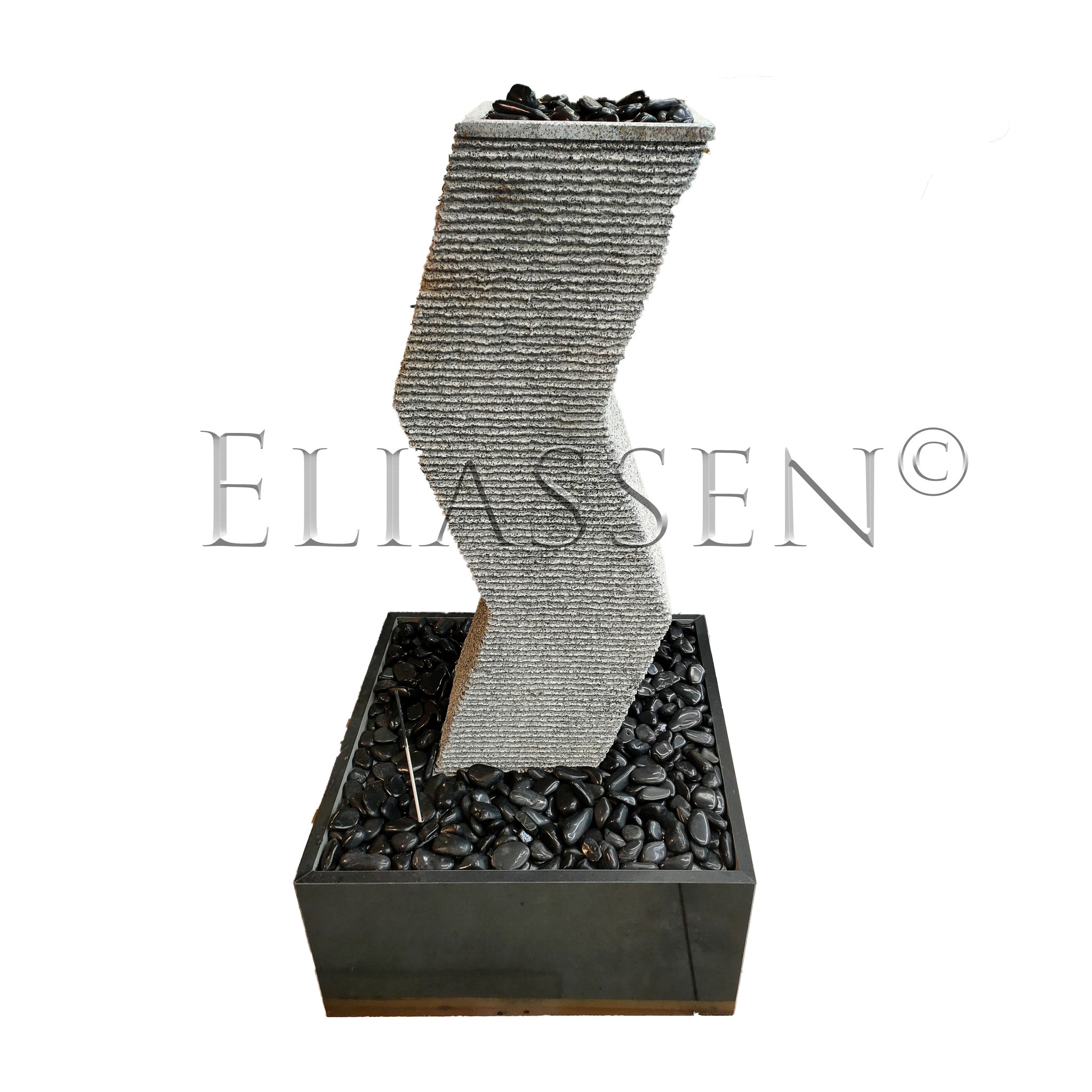 Een prachtig strakke hoge moderne tuinfontein voor in uw tuin of op het terras, in eigen beheer ontwikkeld en nergens anders te koop! De waterbak is gemaakt van effen pikzwart gepolijst graniet, de waterzuil is van grijs graniet die ingezaagd is voor een zeer mooie schittering op het reliëf, zeker in het donker wanneer er een spot op gericht wordt.