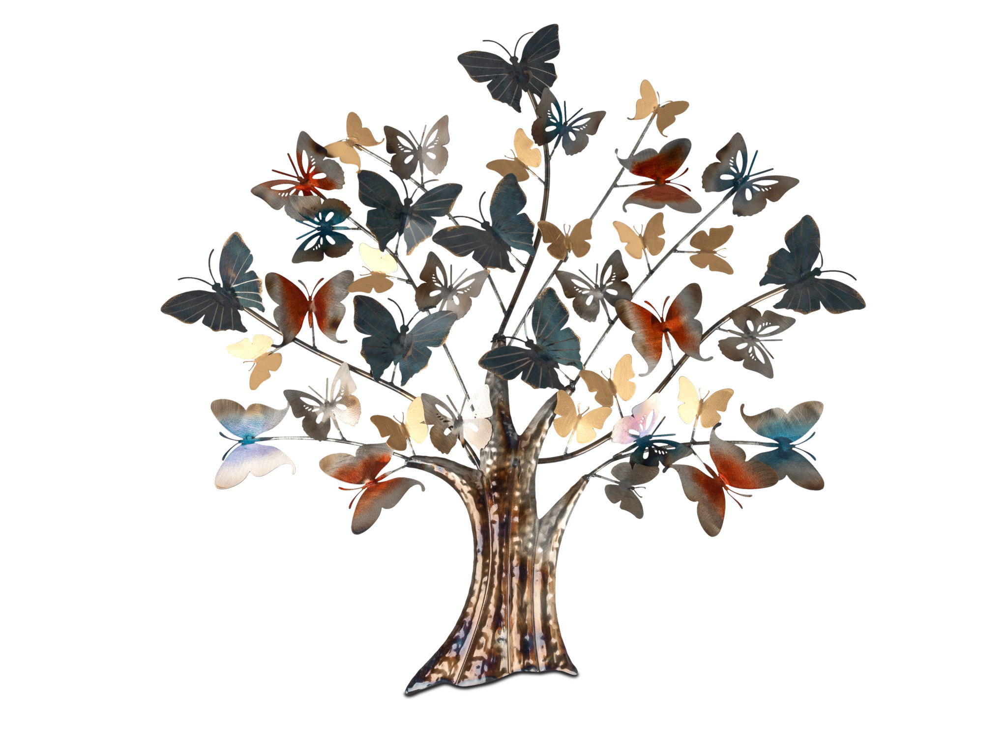 Dit brede 3-dimensionale metalen muurdecoratie met een Boom met vlinders kleedt elk modern interieur of werkplek prachtig aan. Dit sfeervolle en tijdloze stuk wanddecoratie zal een ware blikvanger zijn. Geheel handwerk met gepolijste delen waardoor het geheel een aparte lichtspeling teweeg brengt.