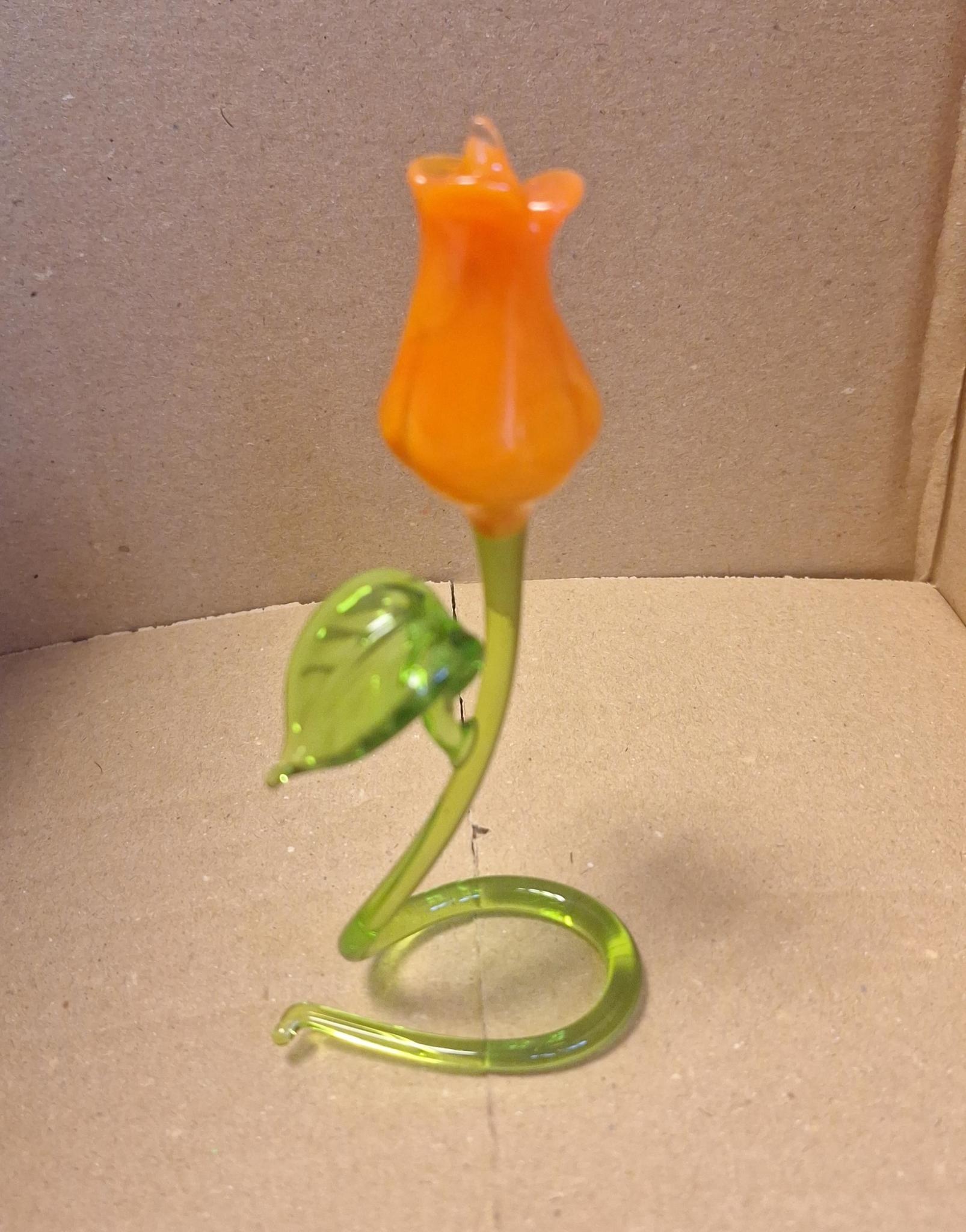 Bent u een liefhebber van glazen voorwerpen?, dan zult U deze oranje gekleurde roos ook wel mooi vinden.