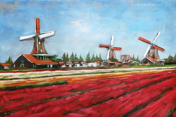 3-D schilderij van een bloembollenveld, helemaal met de hand gemaakt van ijzer, ook de achtergrond dus.