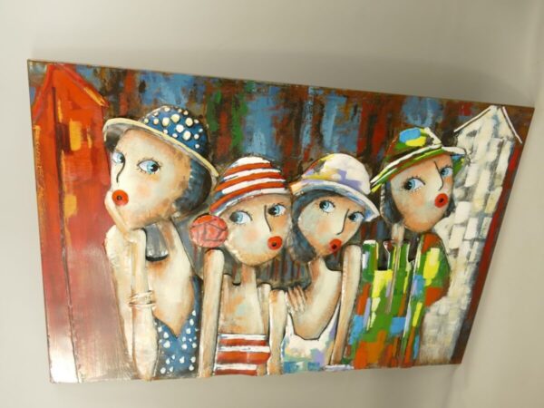 Handgeschilderd 3d metalen schilderij van vier gezellige dames. Afmeting 120x80cm hoog.