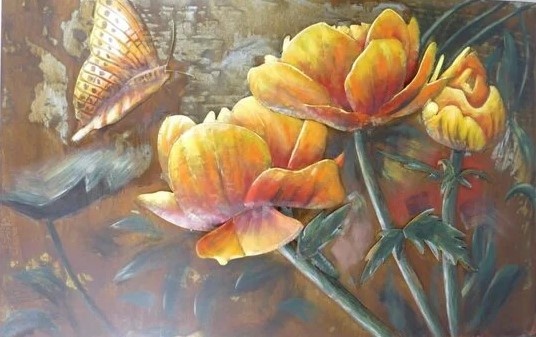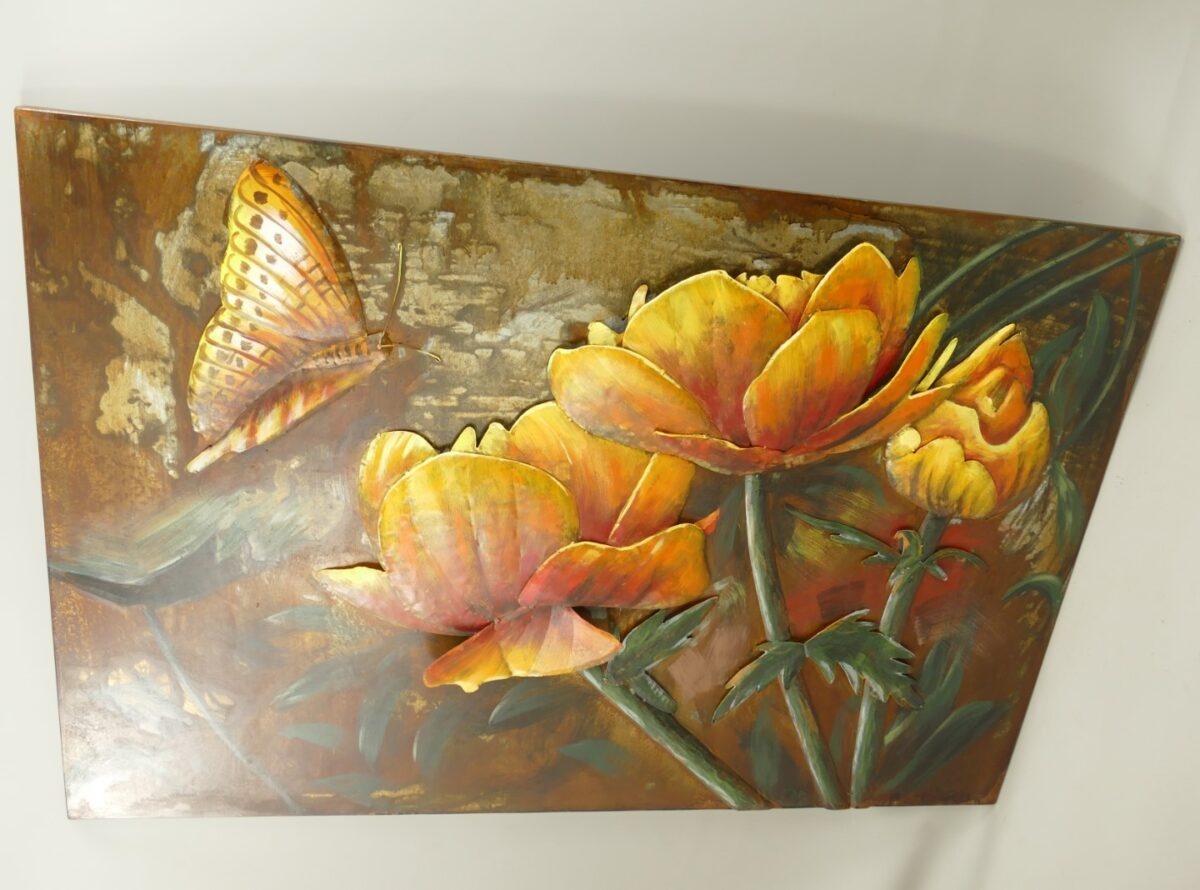 Handgeschilderd 3d metalen schilderij van een vlinder met gele bloemen. Afmeting 120x80cm hoog.
