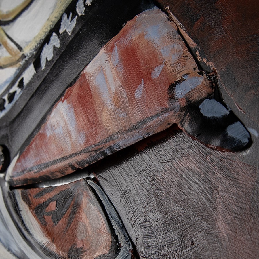 Alles van deze wanddecoratie is van metaal, achtergrond en dus ook de figuur. Omdat het handgeschilderd en gemaakt is, kan de kleur iets afwijken van de foto, ze zijn nooit precies hetzelfde. Op deze een beetje ruig gemaakte schilderijen kunnen altijd nog verder kleine afwijking zitten, soms is dat zelfs express gedaan om de stoere sfeer te bewerkstelligen.