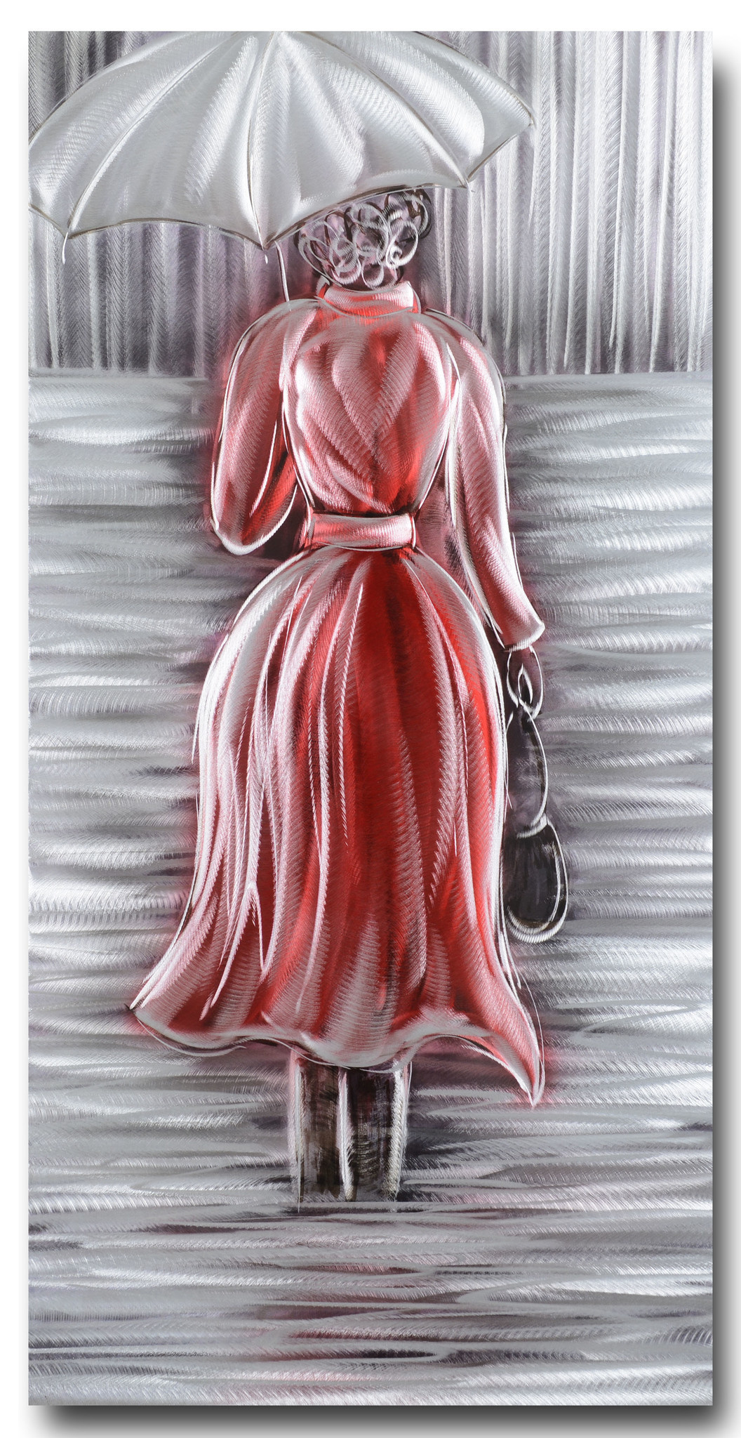 Wilt u een bijzonder schilderij aan de muur hangen, met daarop een vrouw afgebeeld in de regen met een elegante rode jas, met een totaal eigen uitstraling? Dan mag u dit zeer moderne aluminium schilderij van het exclusieve merk ArtEl absoluut niet missen. Helemaal met de hand vervaardigd. Door het vele handmatige schuur en polijstwerk op een aluminiumplaat, in combinatie met de gekozen heldere kleuren, wordt er een hypermoderne en eigentijds stuk muurdecoratie voor uw werk- en leefomgeving gecreëerd. Dit schilderij is bijna 3cm dik, achterzijde is mooi afgewerkt met zwarte velours, en voorzien van haakjes.