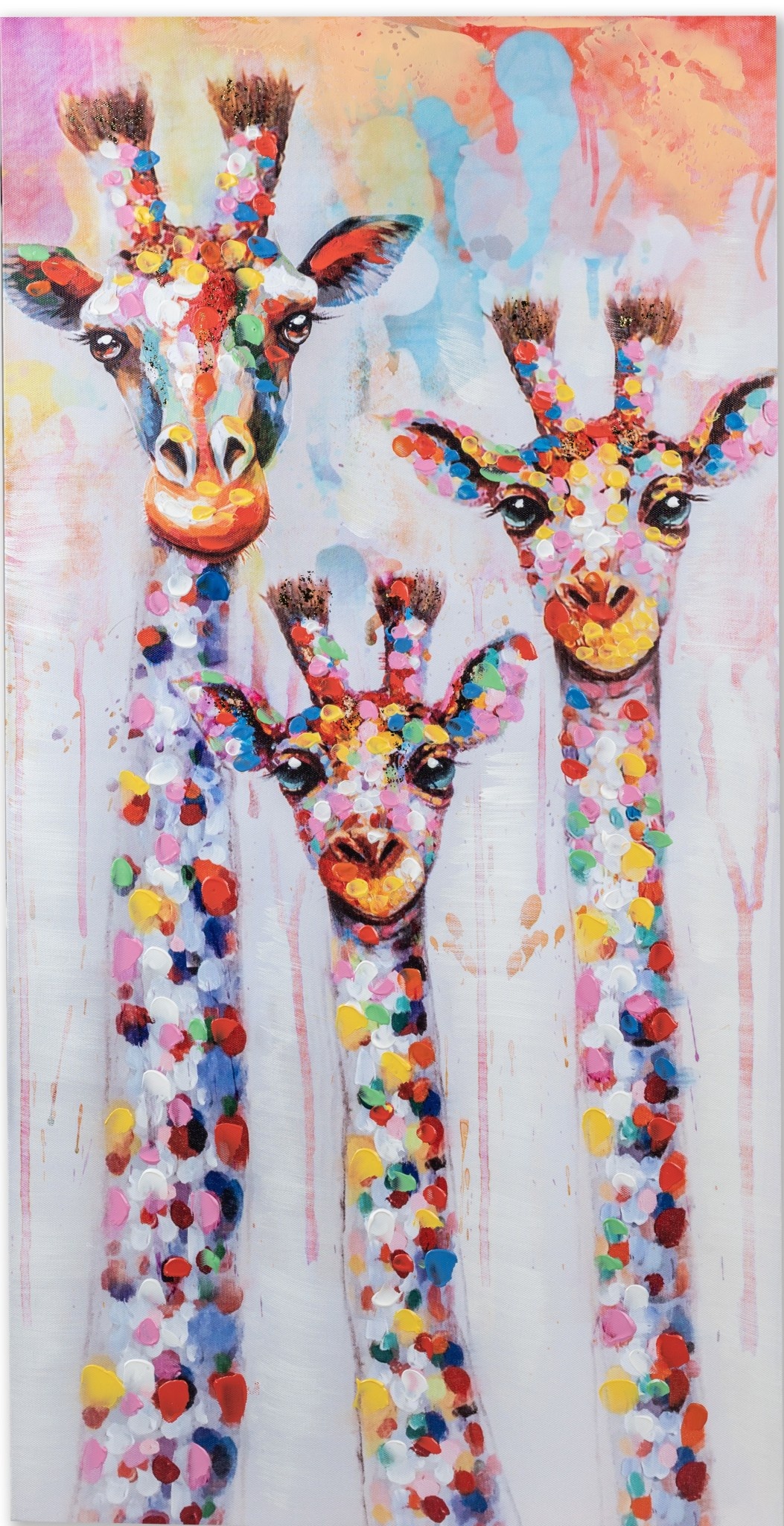 Dit kleurrijke moderne schilderij met de afbeelding van 3 Giraffen is zorgvuldig gemaakt met de mooiste kleurcomposities, en met veel aandacht voor de finishing touch!