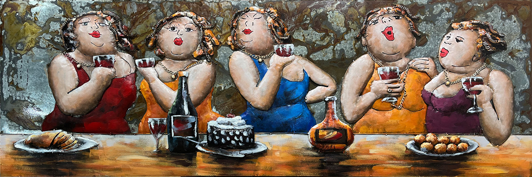 Mooi wordt uw huis met een dit kleurrijke stuk muurdecoratie van een vijftal dikke dames die genieten van een heerlijke borrel. Dit metalen 3D schilderij is helemaal met de hand gemaakt. Alles van deze wanddecoratie is van metaal, achtergrond en ook de figuur.