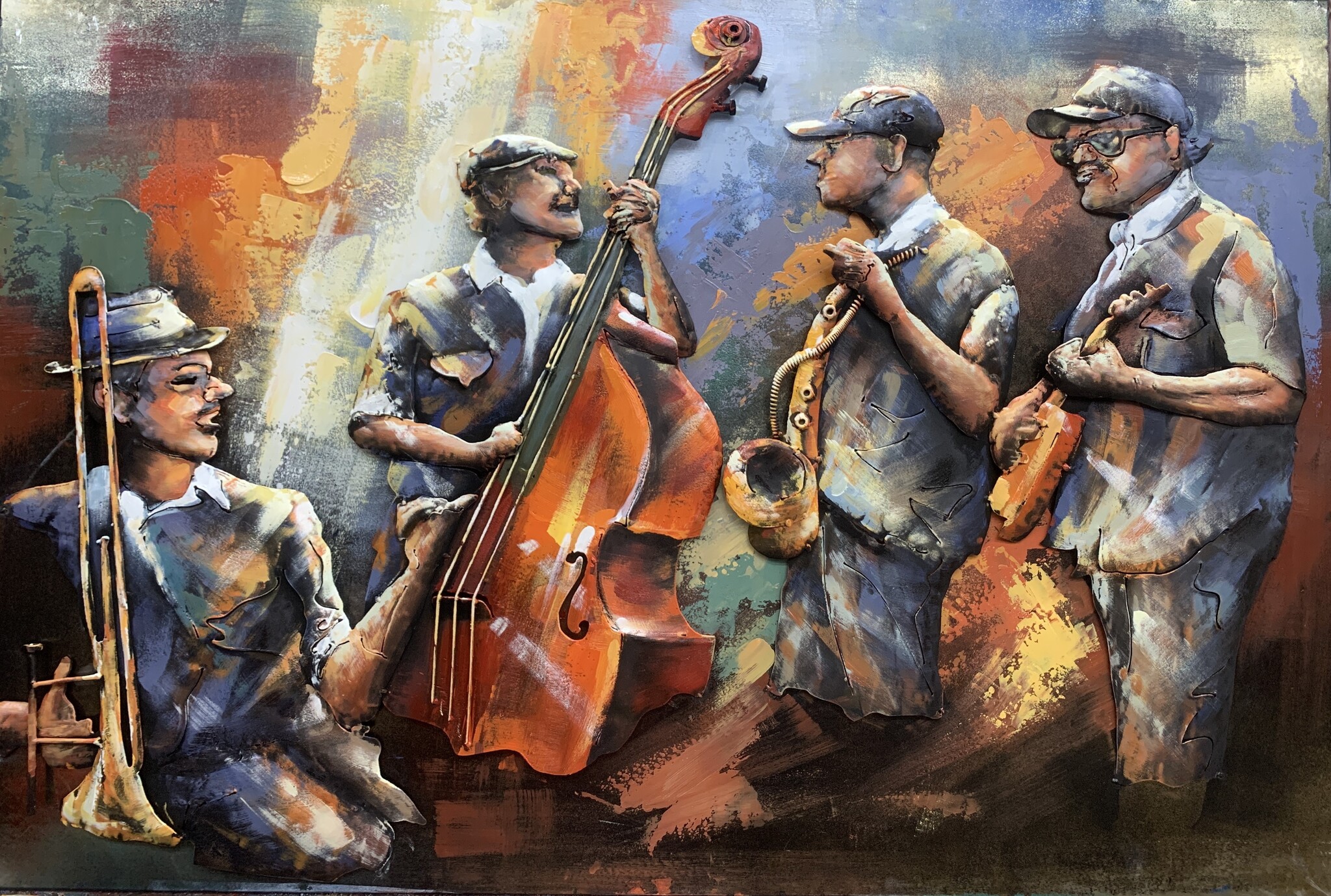 Een prachtig 3D Metalen schilderij, met de afbeelding van een spelende jazz band, subliem gemaakt van losse delen metaal, die allemaal met de hand aan elkaar gelast zijn, om een optimaal 3d effect te verkrijgen. Een prachtig stuk muurdecoratie voor in huis, buiten onder een afdak of in uw bedrijf. Kleuren en algemene uitstraling kunnen afwijken van de foto aangezien dit hele object door mensen handen gemaakt is.