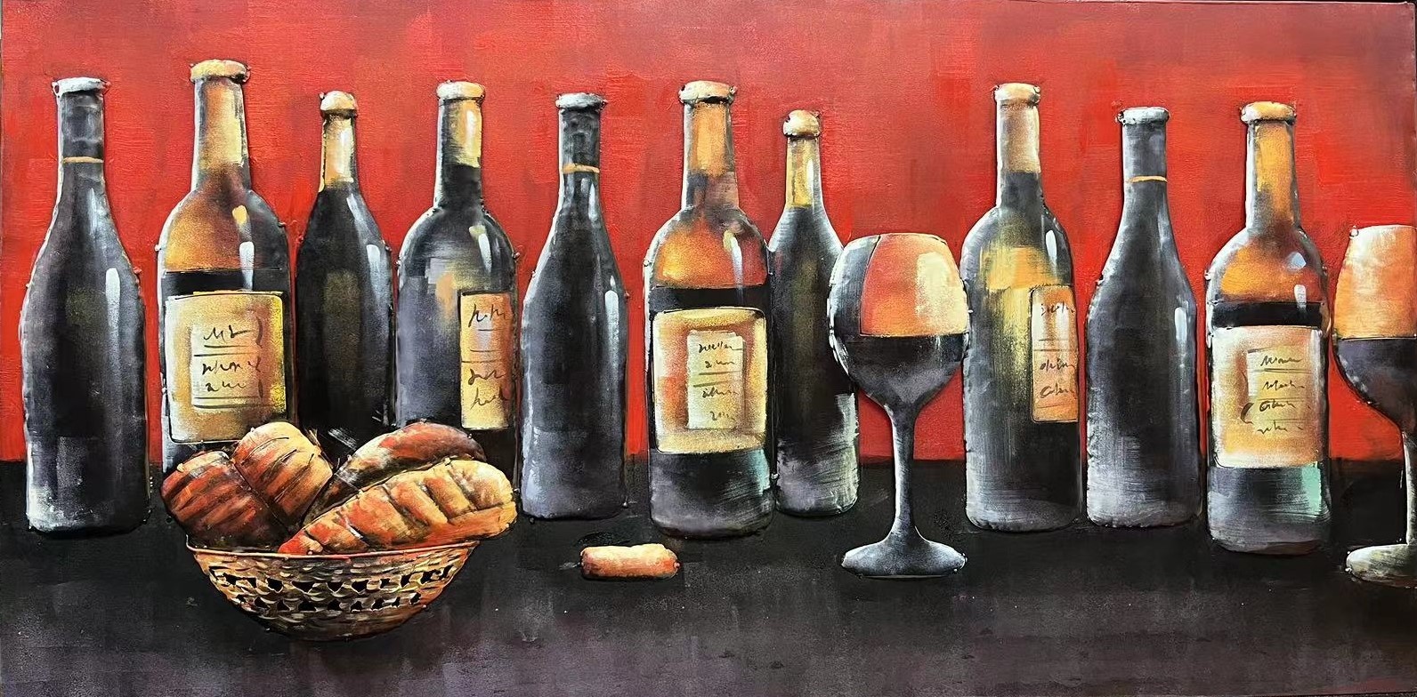 Mooi wordt uw huis met een dit stuk muurdecoratie van een rij flessen wijn welke goed zou staan in uw keuken of bar. Dit metalen 3D schilderij is helemaal met de hand gemaakt. Alles van deze wanddecoratie is van metaal, achtergrond en ook de figuur.