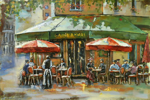 Een prachtig 3D Metalen schilderij, met de afbeelding van een terrasje in een rustige sfeer, subliem gemaakt van losse delen metaal, die allemaal met de hand aan elkaar gelast zijn, om een optimaal 3d effect te verkrijgen. Een prachtig stuk muurdecoratie voor in huis, buiten onder een afdak of in uw bedrijf. Kleuren en algemene uitstraling kunnen afwijken van de foto aangezien dit hele object door mensen handen gemaakt is.