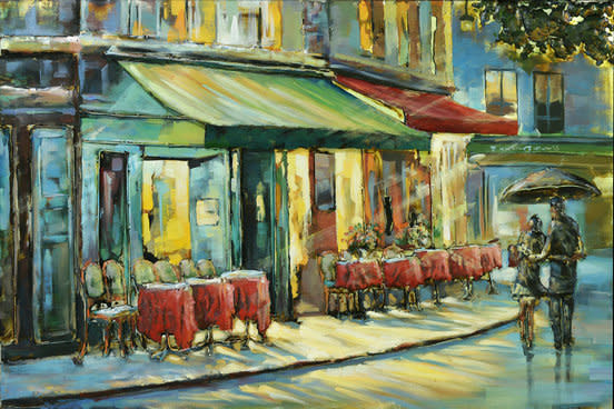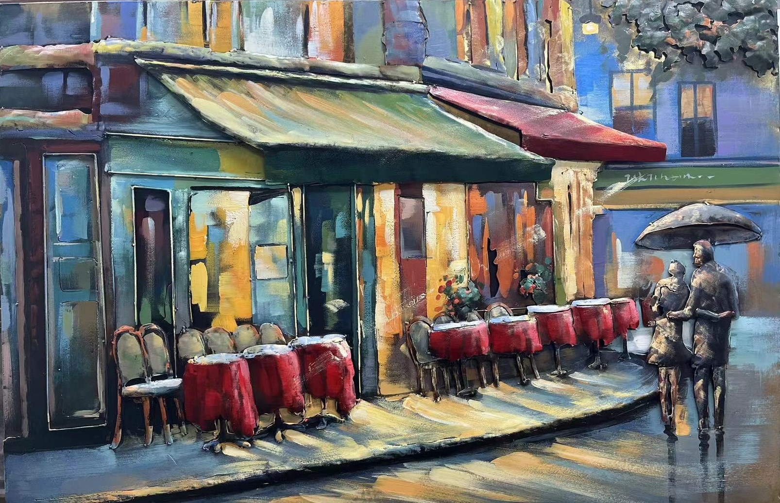 Handgeschilderd 3d metalen schilderij van een terras voor een tunneltje. Afmeting 120x80cm hoog.